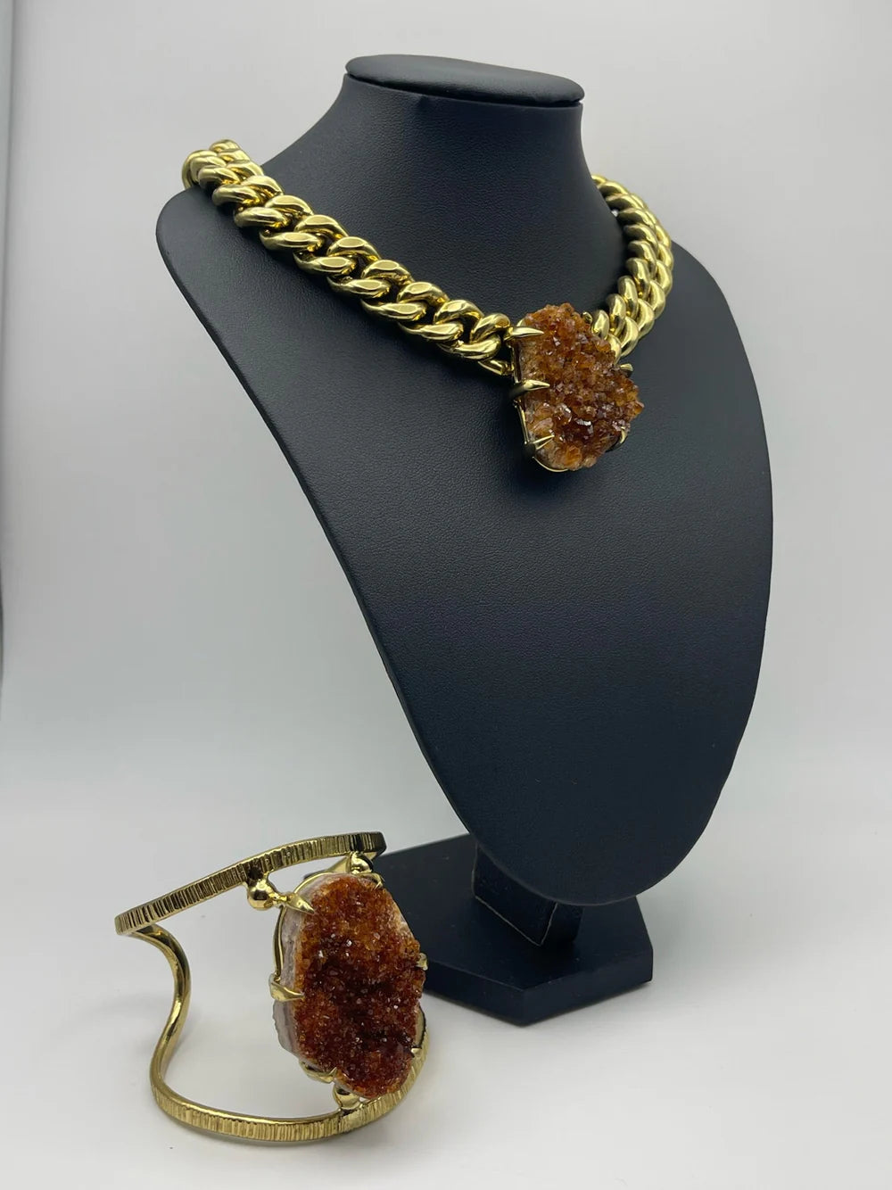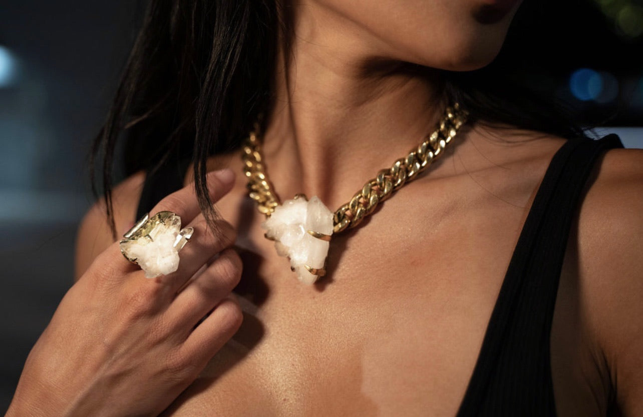 A refined take on our bold signature chain, the Iconic Quartz Petite Chain Necklace brings together a heavyweight gold link silhouette with a raw crystal quartz focal point. The stone’s natural clarity and structure give the piece its quiet power — a modern statement that radiates confidence with effortless ease.