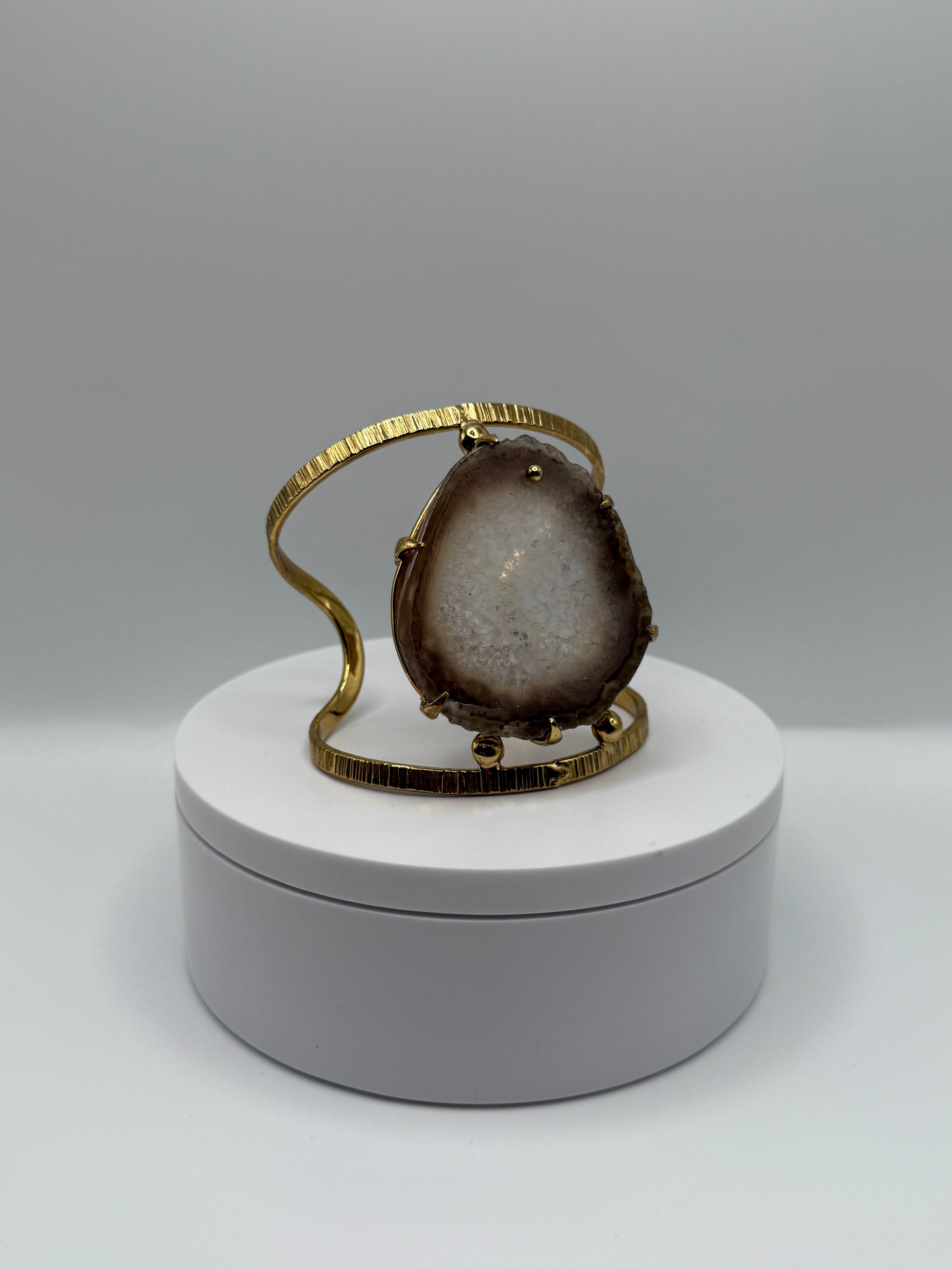 A relic of earth’s inner alchemy, the Celestia Cuff is designed around a rare, natural agate slice, making each piece entirely one-of-a-kind. The crystal’s center reveals a galaxy of druzy sparkle, framed by an irregular organic edge — a raw elegance only nature could compose.