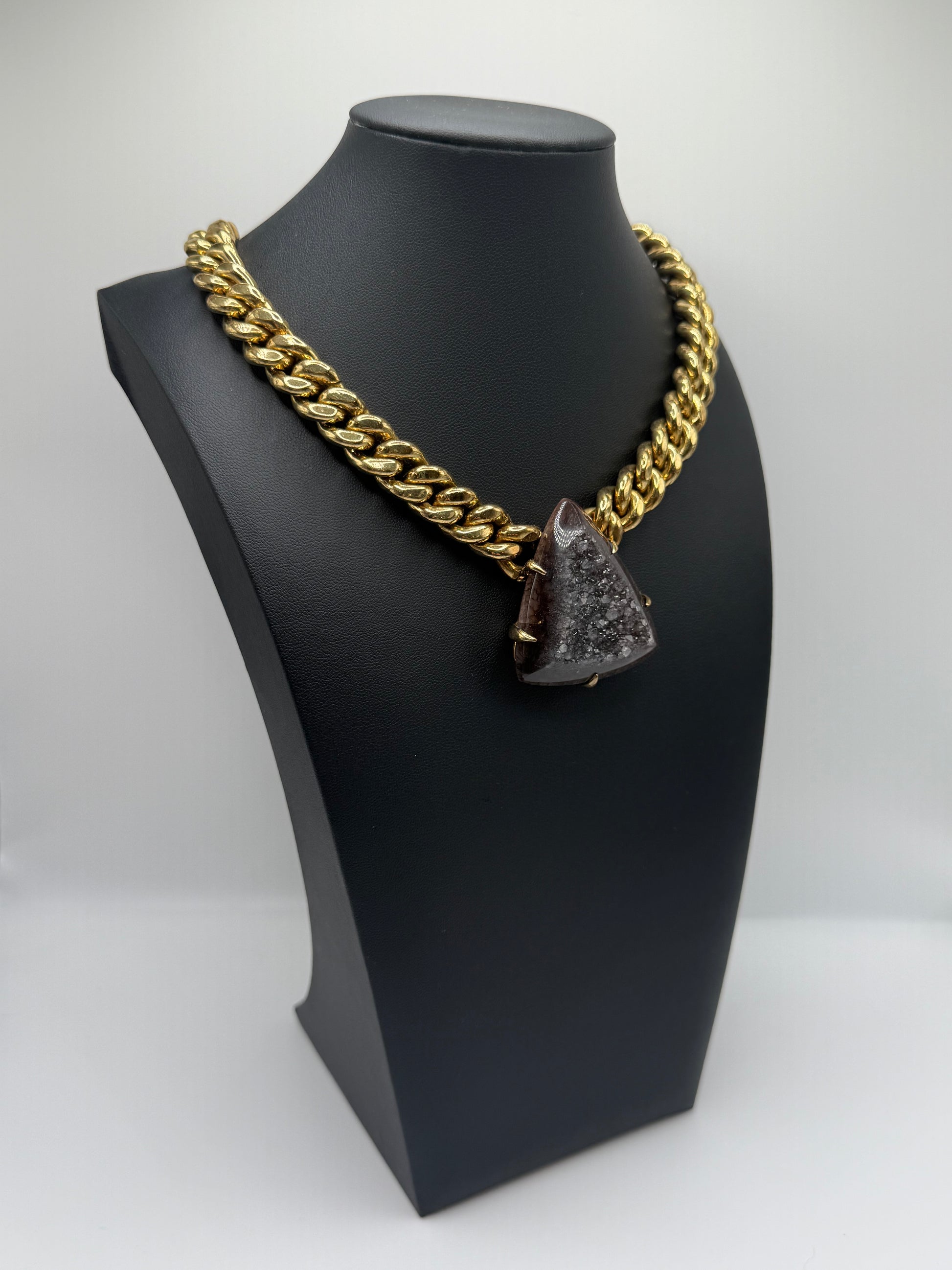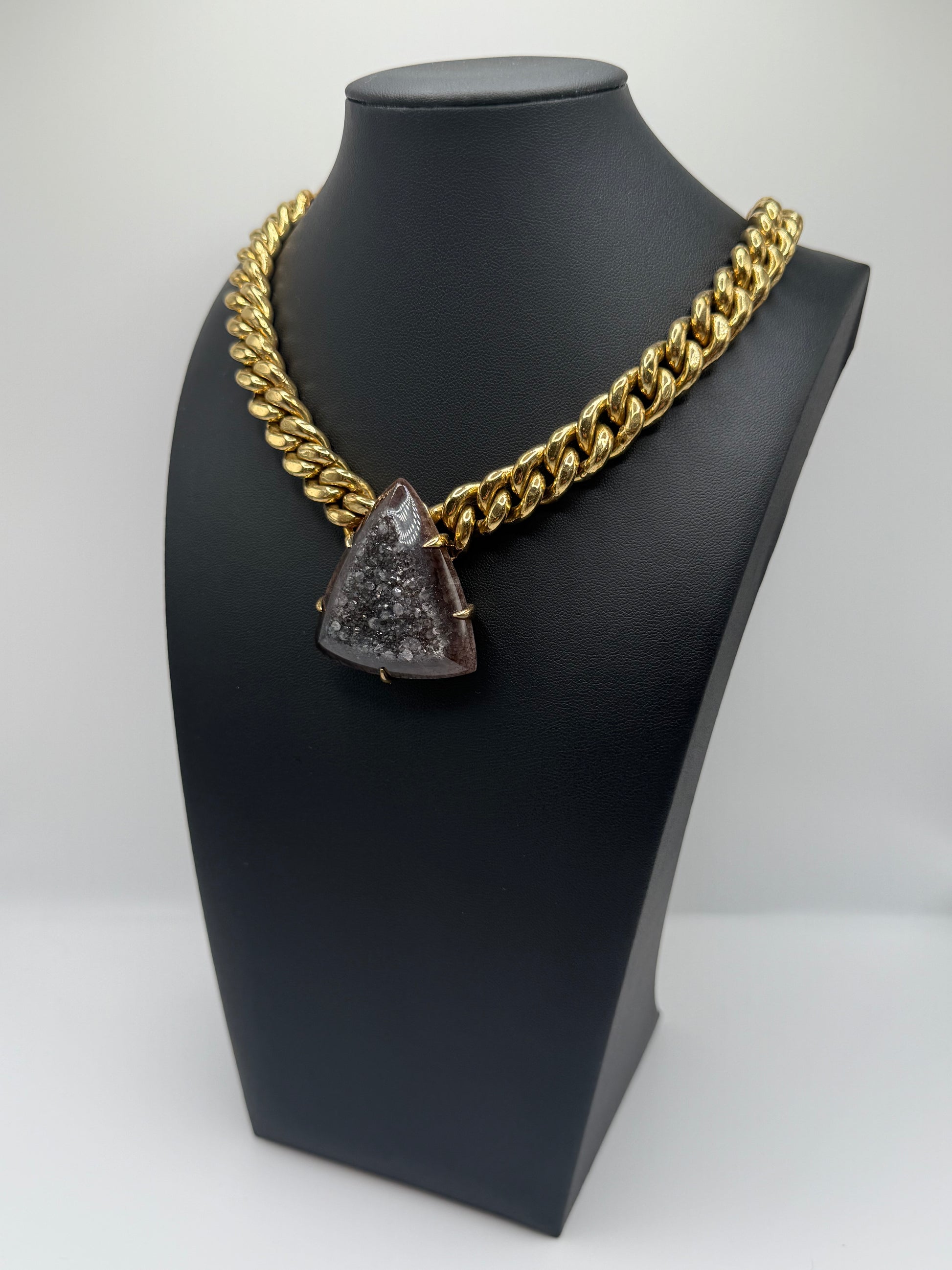 Make a fierce statement with the Black Agate Druzy Triangle Chain. Featuring a bold, high-polish gold chain and a dramatic black agate druzy stone cut in a sharp triangular form, this necklace radiates edge and elegance. The natural druzy sparkles with raw texture, catching the light like crystal dust, while the substantial chain adds a sense of strength and presence. Imported from Bali, this piece blends natural mystique with bold design—perfect for turning heads and holding space.