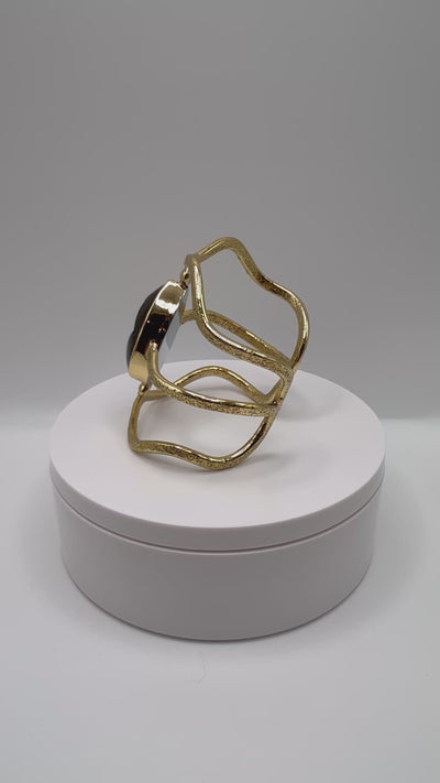 A sculptural statement, the Midnight Halo Cuff features a deep navy black druzy teardrop framed in a fluid, wave-like gold setting. The cuff’s open design and soft texture give it a modern yet celestial presence, echoing the mystery and power of nightfall. It’s bold without being bulky, designed for the woman who commands space with grace.