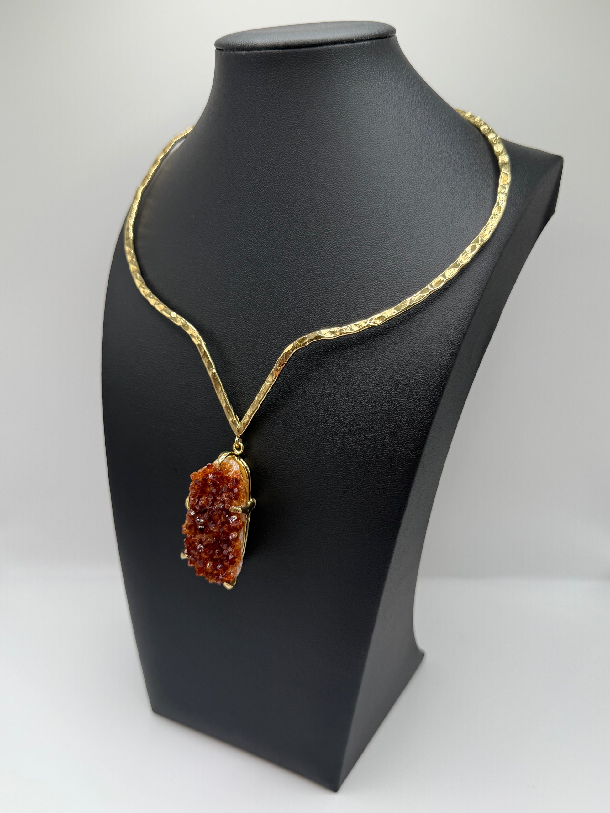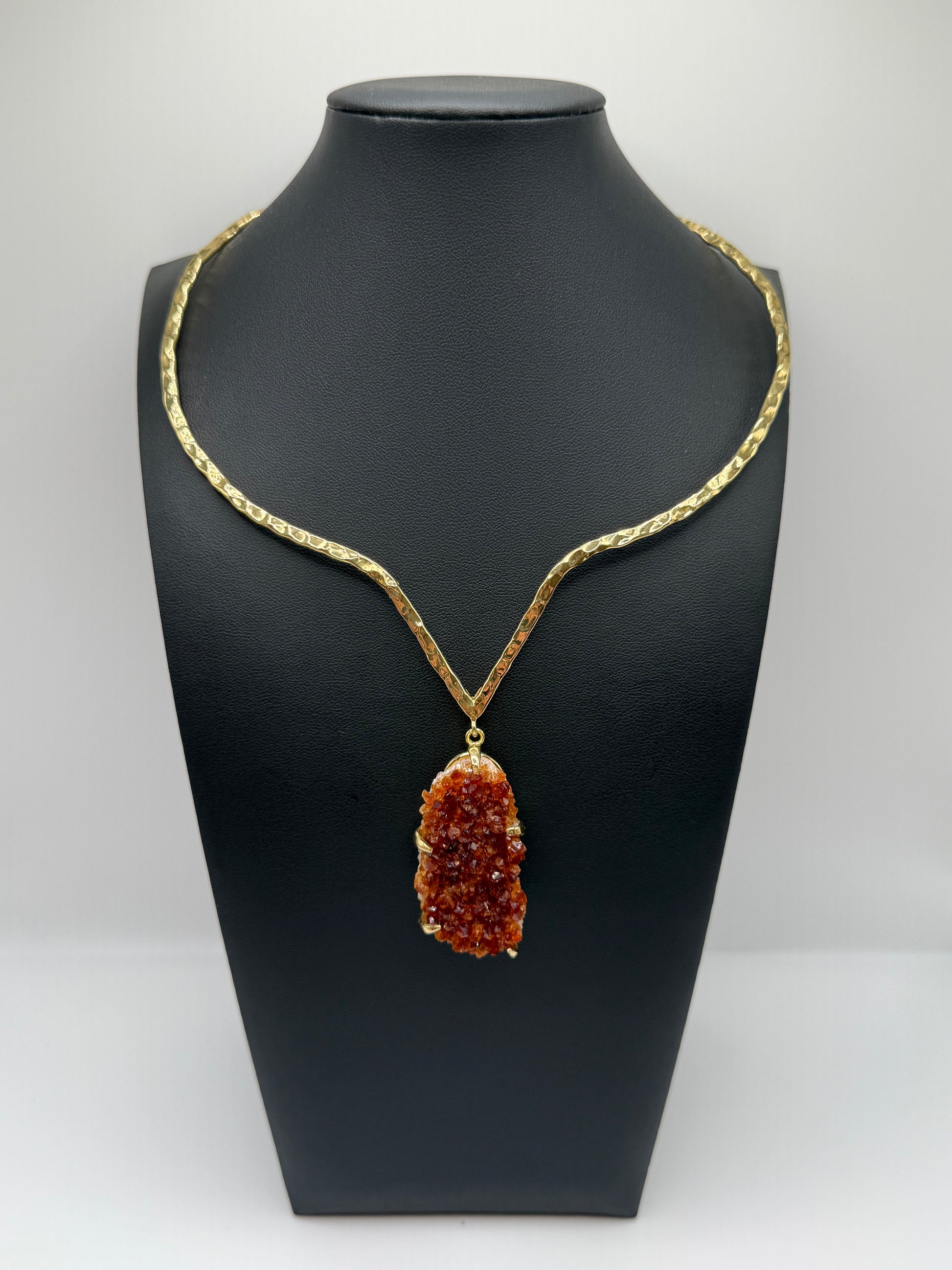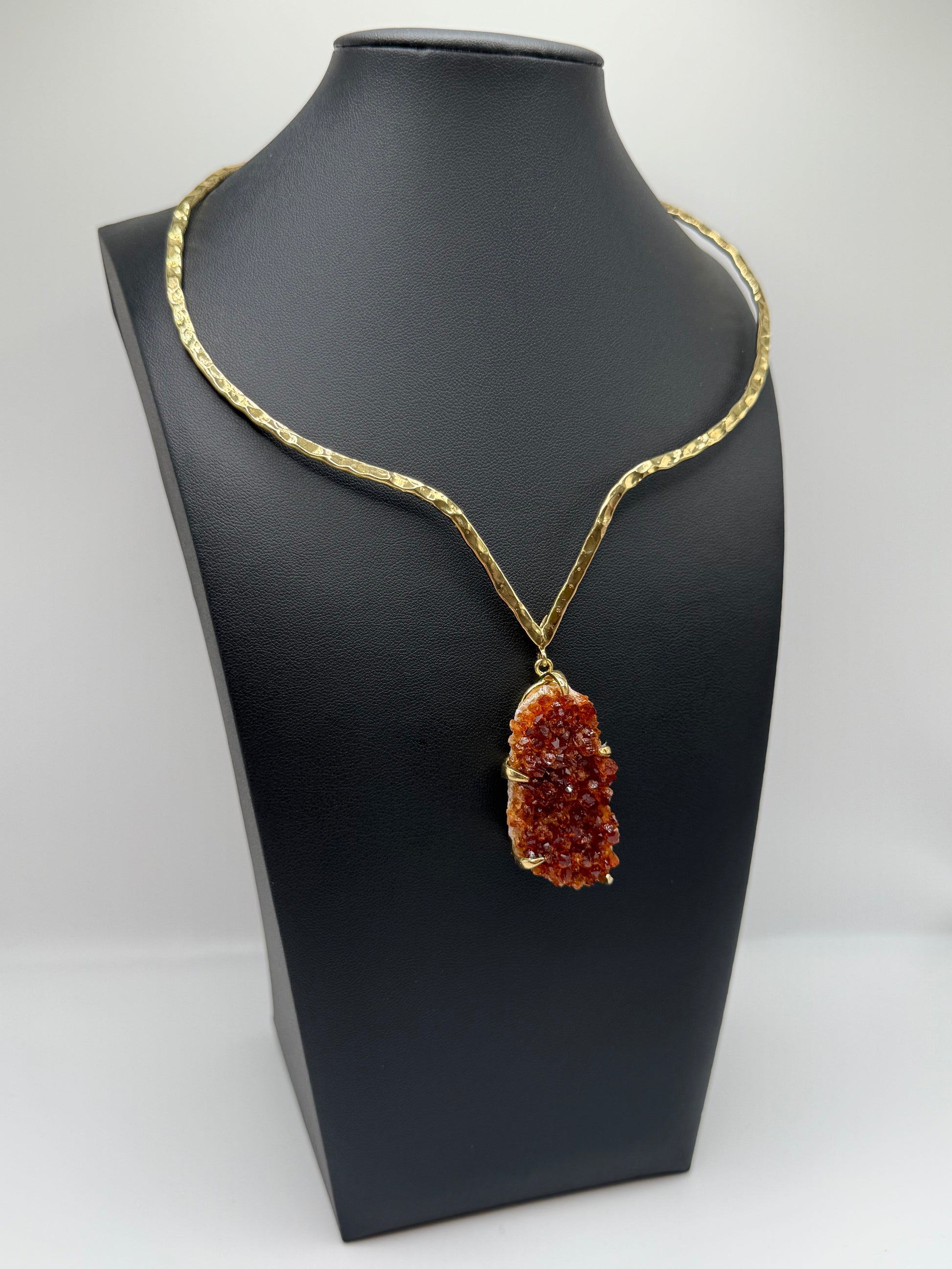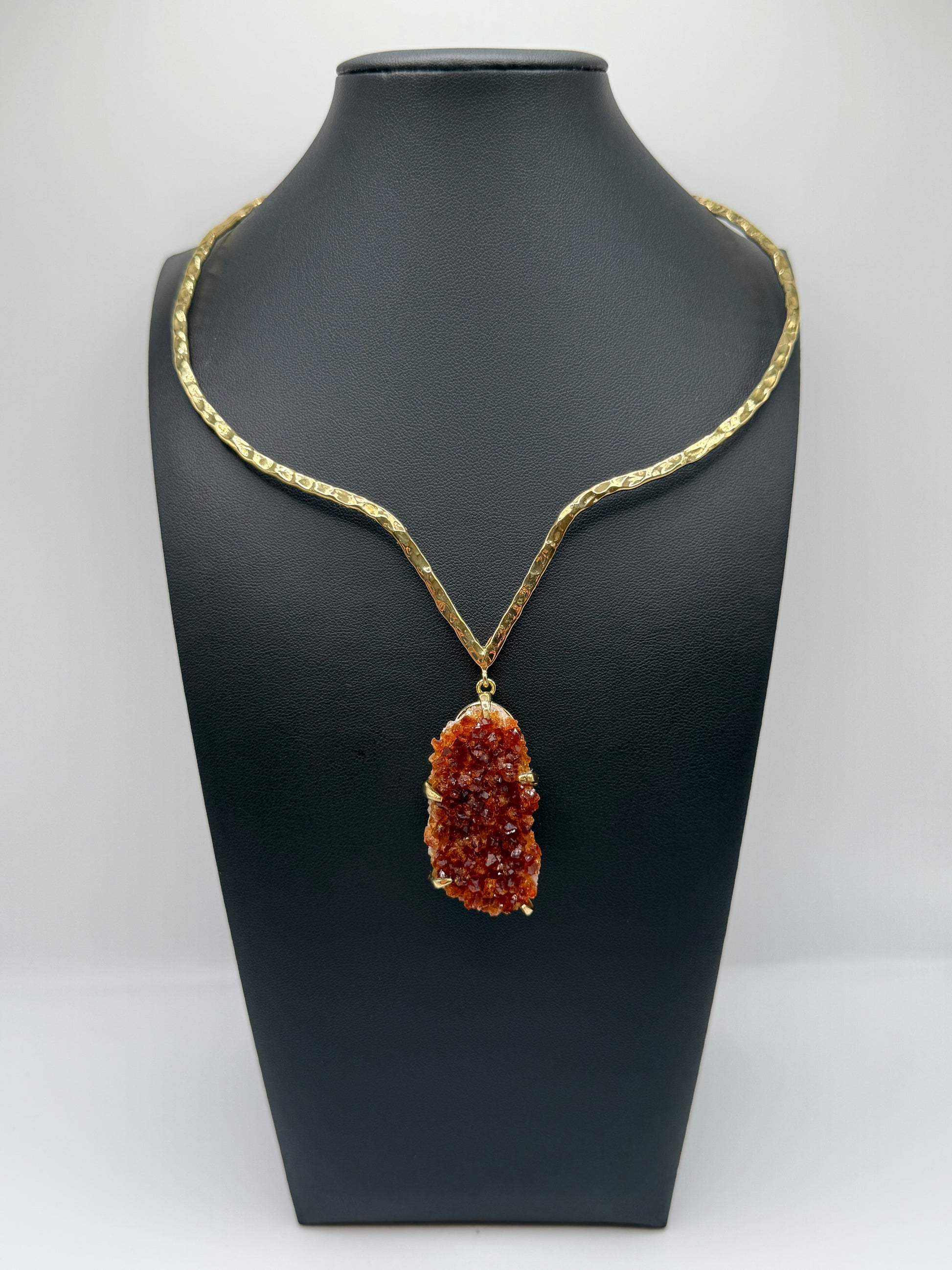 A vibrant cluster of burnt orange crystal framed in hand-hammered brass, glowing with the warmth of flame and earth. Its raw texture catches light from every angle, alive with quiet intensity. Amber Ember embodies passion refined — grounded, radiant, and full of fire