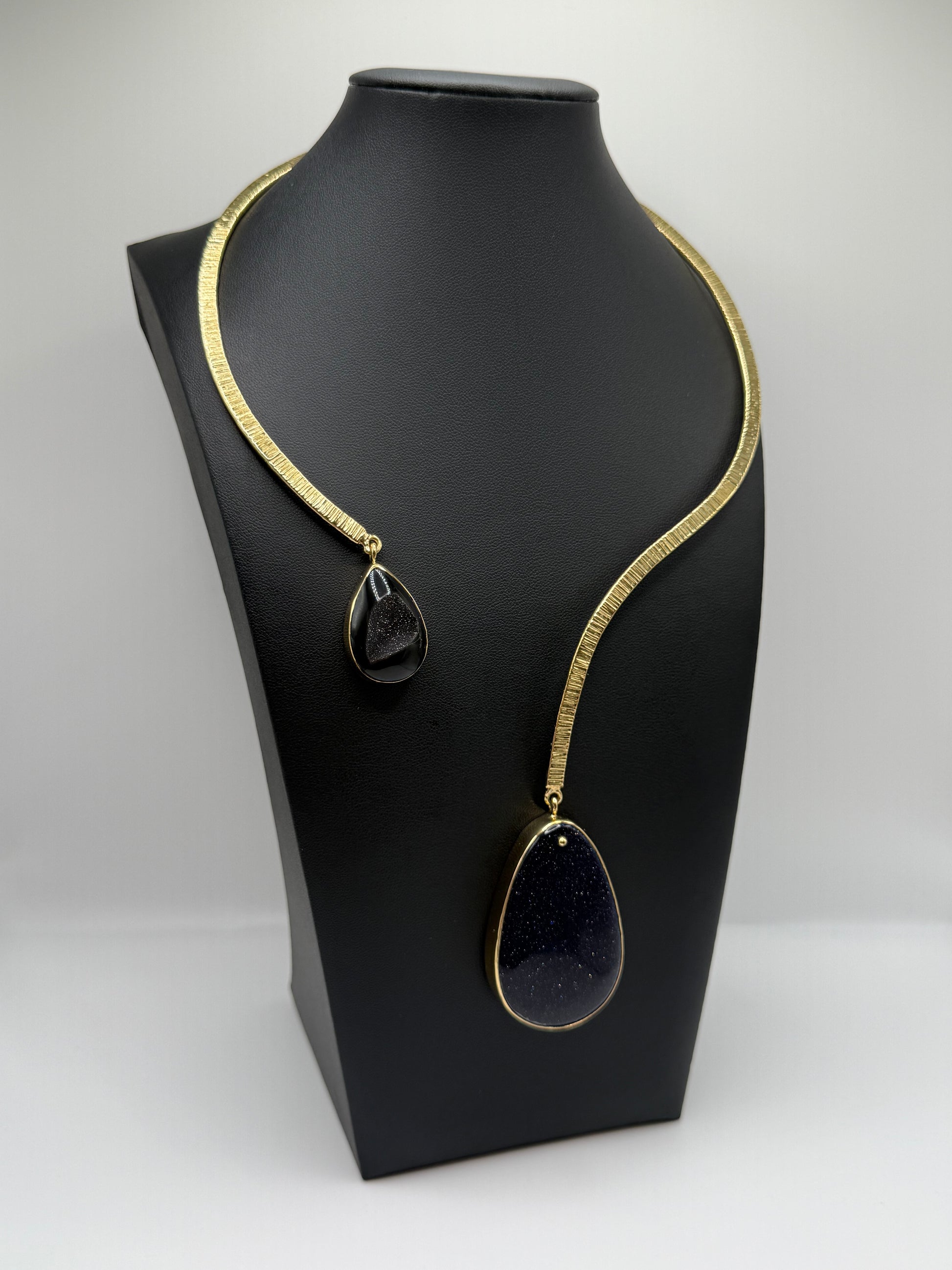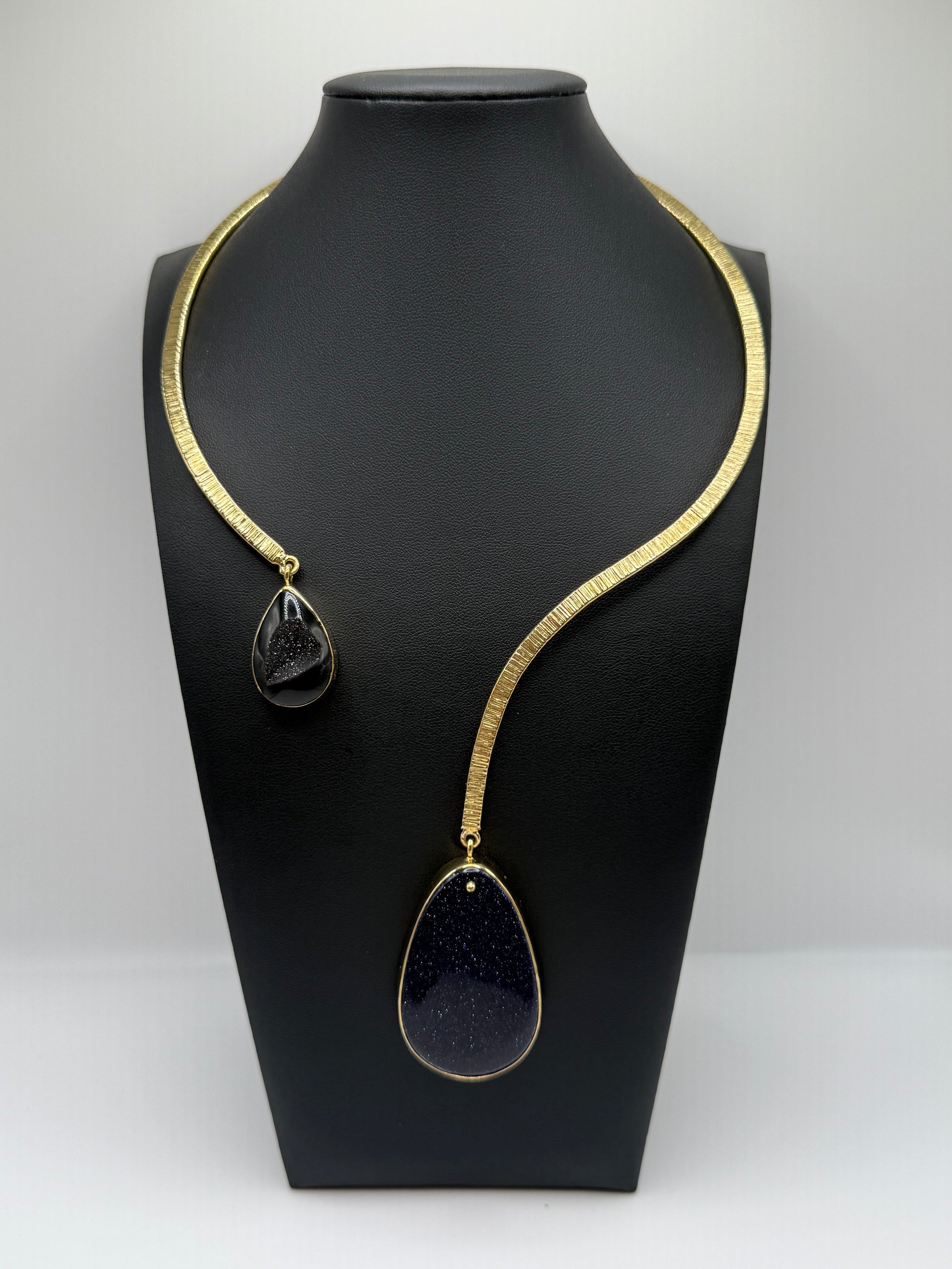 A deep violet stone shimmers with flecks of light, suspended, sultry asymmetrical balance from a sculpted brass. It's surface evokes the night sky — infinite, alluring, and full of possibility. Midnight Reverie embodies the art of quiet confidence, where darkness meets radiance.