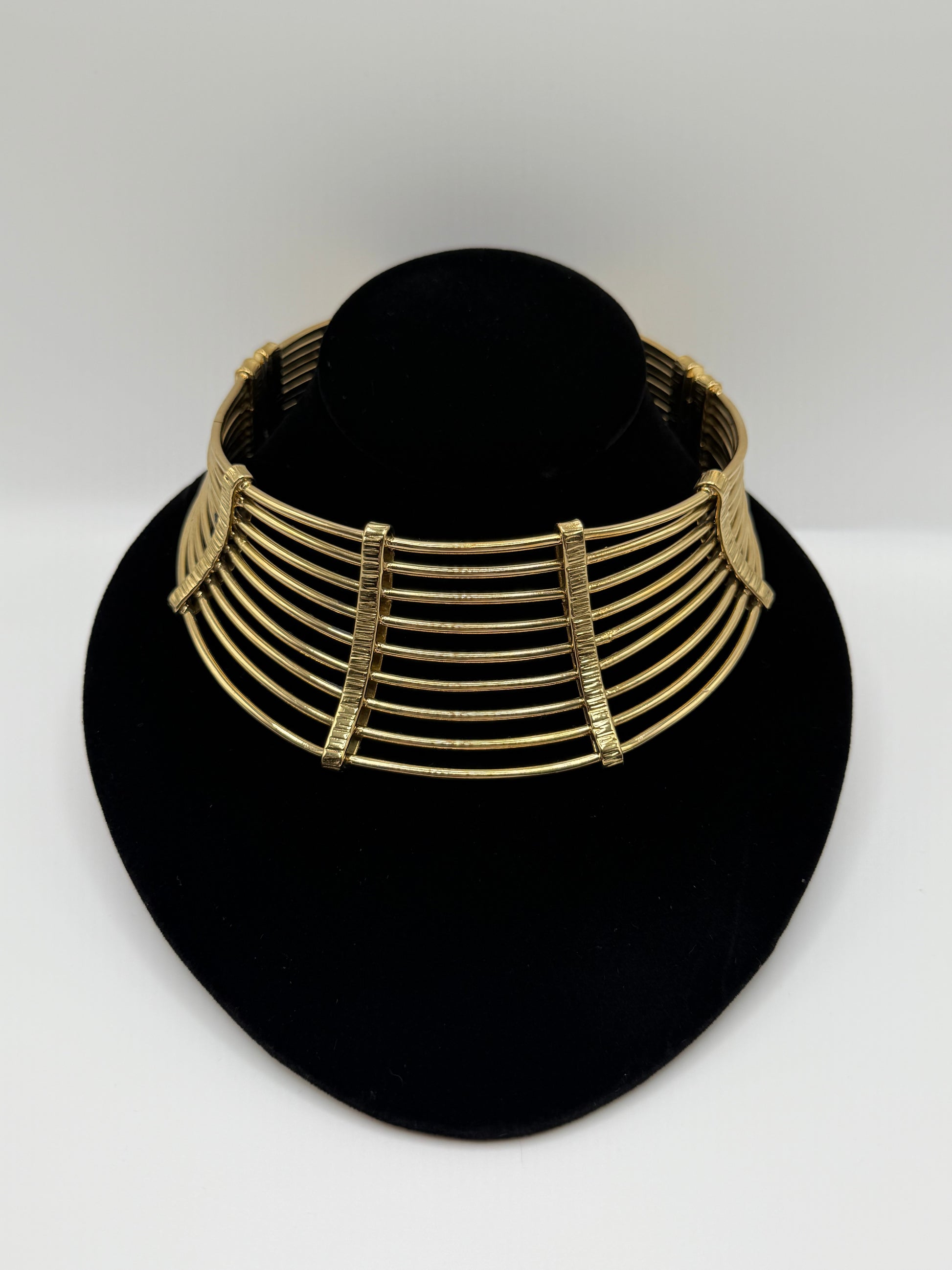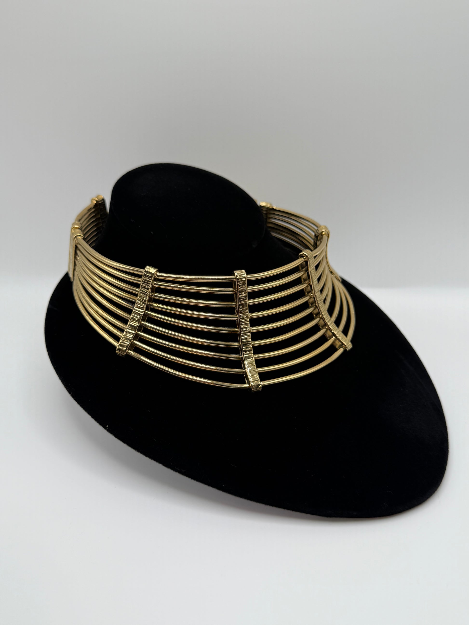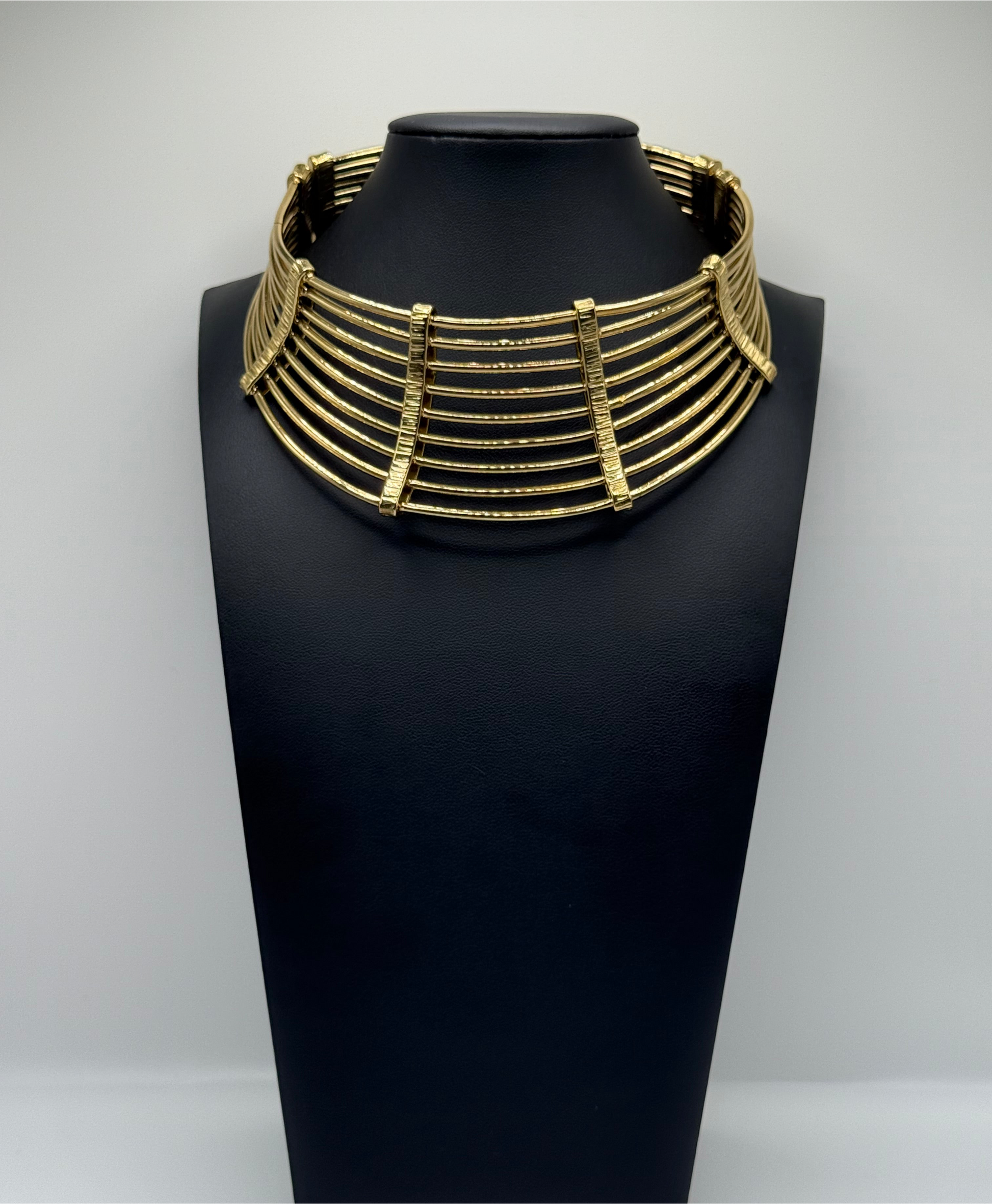 A radiant tribute to the sun at its peak, Solstice captures the bold warmth of golden light in sculptural form. This collar-style piece commands presence with its architectural structure and shimmering metallic lines balancing strength with fluid elegance. Its name evokes the turning point of seasons, a reminder of cycles, ceremony, and feminine power. Wear it as a statement of confidence, transformation, and celestial grace.