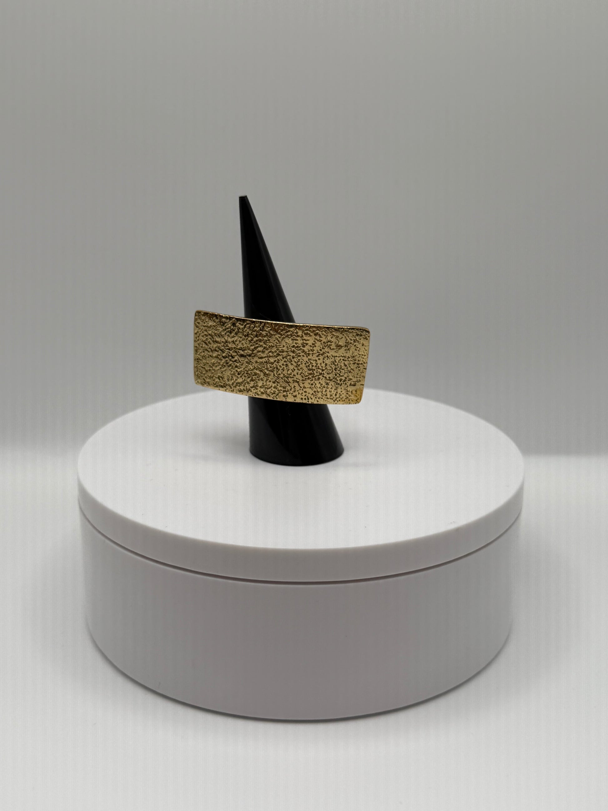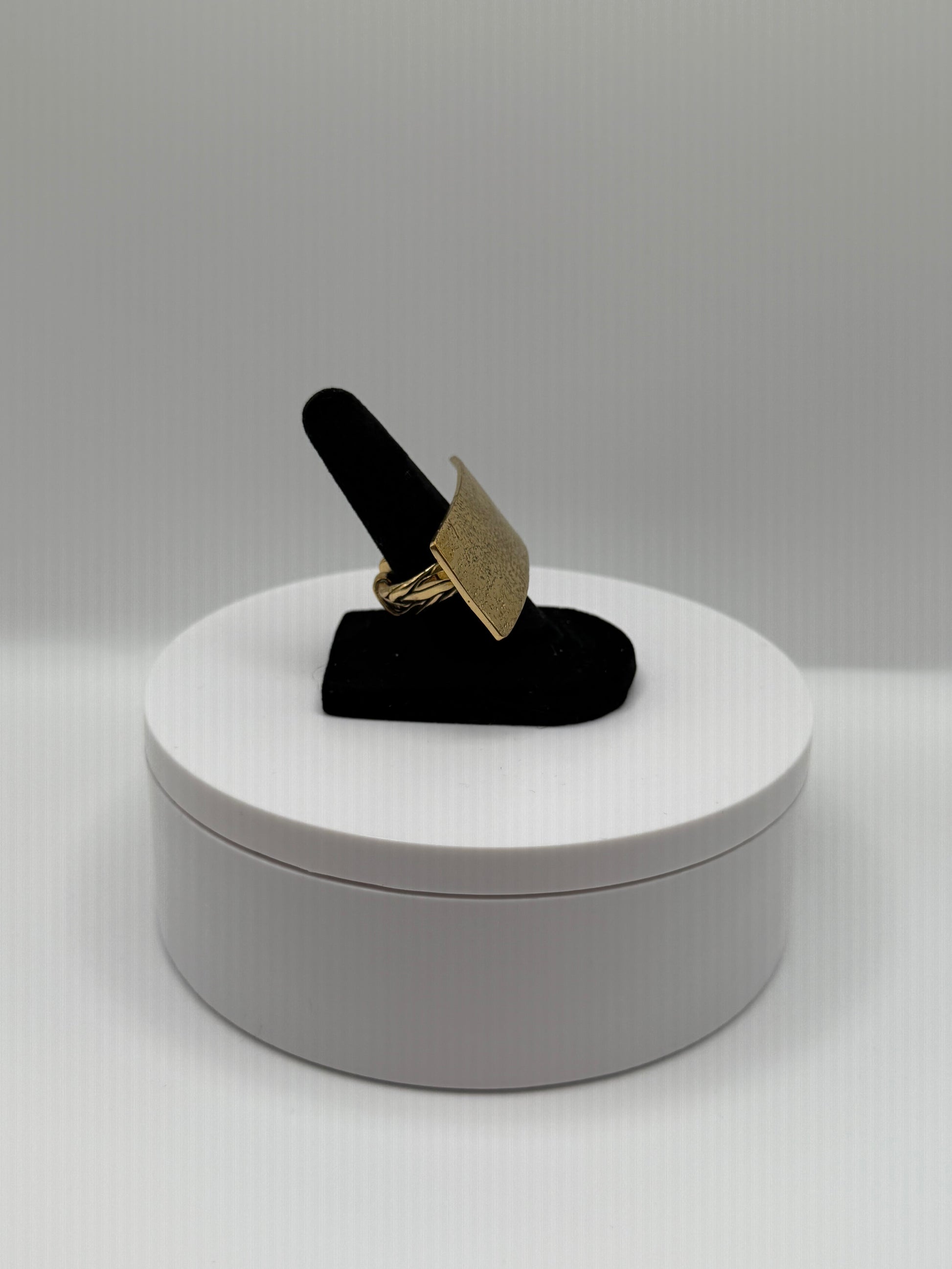 The Golden Horizon Ring features a wide, textured gold-toned plate that exudes timeless sophistication and bold design. Its striking rectangular surface reflects a rugged elegance, making it a perfect statement piece for any outfit. This ring is ideal for those who love unique, standout accessories that combine artistry and versatility.