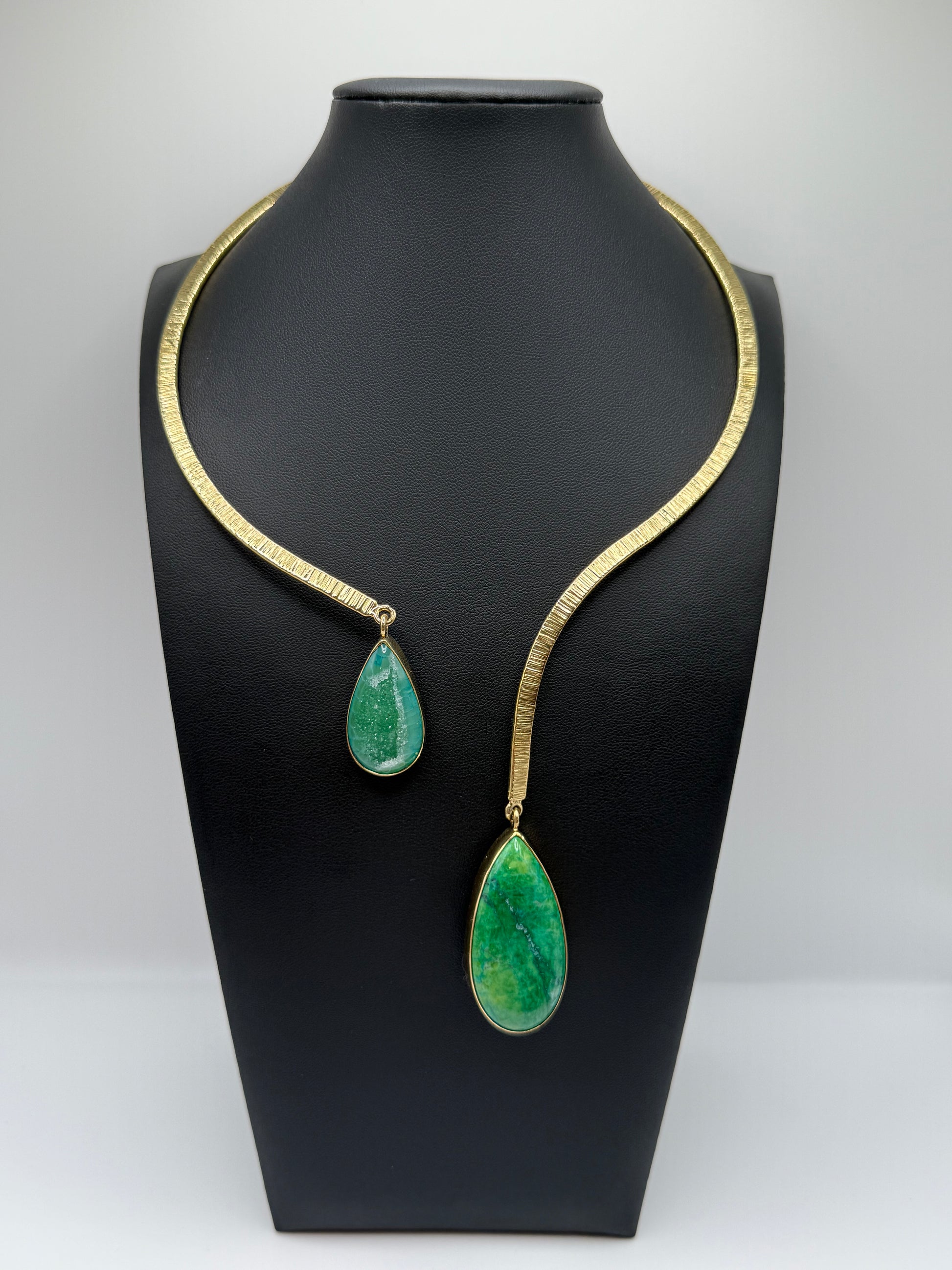 Twin drops of vivid green agate cascade from a sculpted brass form — fluid, vibrant, and full of life. The asymmetry creates effortless balance, echoing nature’s own rhythm. Verdant Flow captures growth in motion — organic, bold, and unmistakably individual.