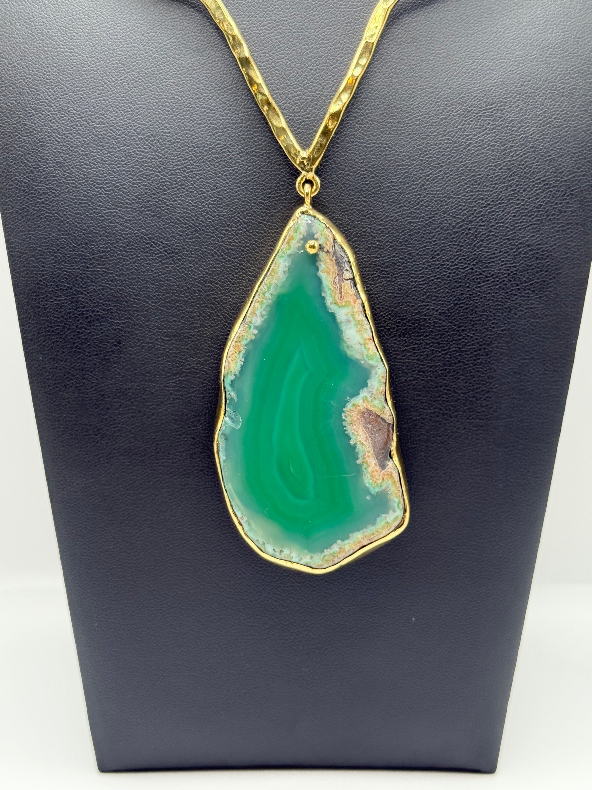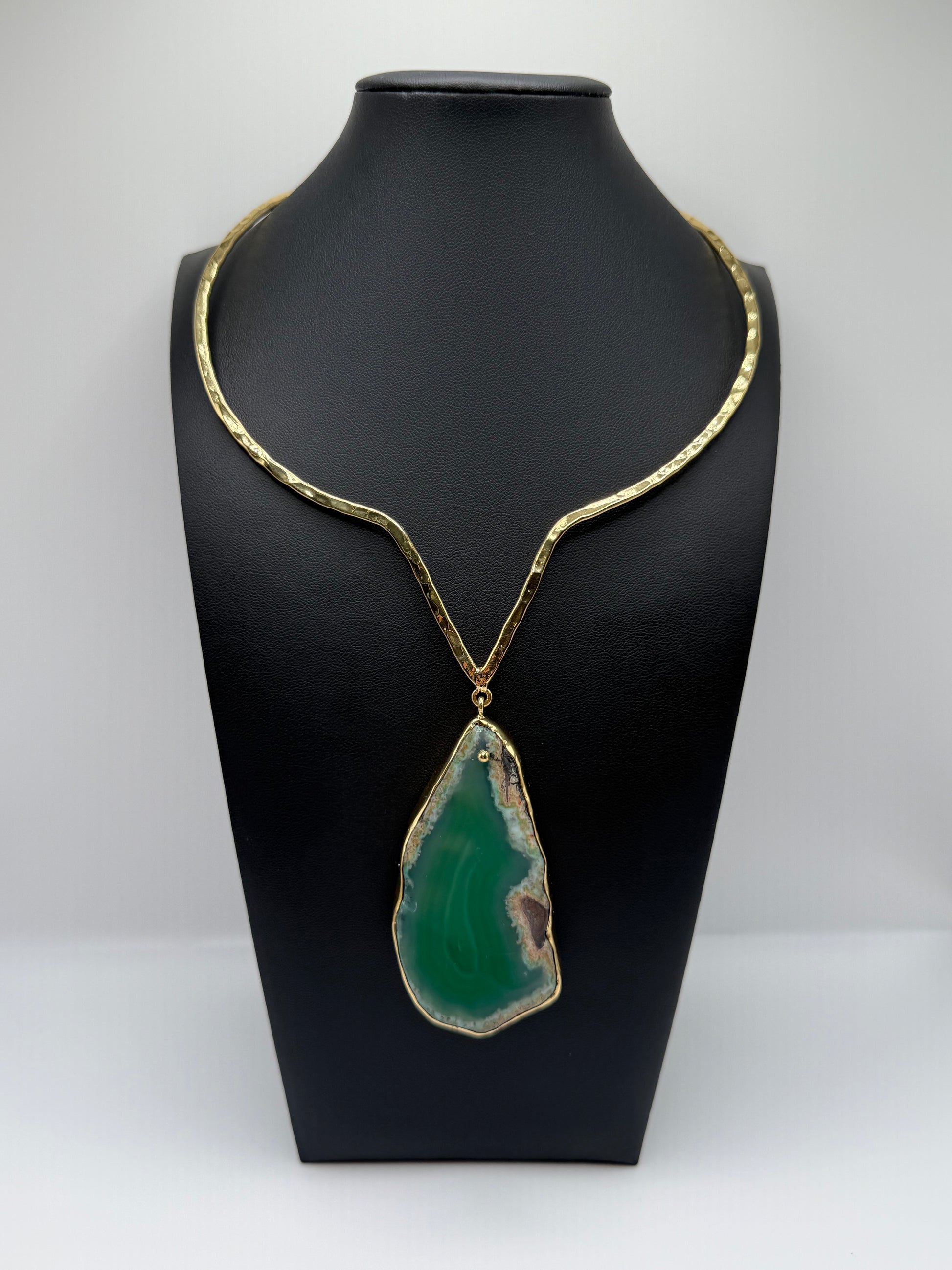 Like a tide drawn from the heart of the earth, Emerald Drift carries an organic elegance that feels both grounded and otherworldly. A bold slice of green agate floats beneath a gently hammered, V-shaped gold collar mimicking the flow of nature’s path carved through stone and time. This piece brings effortless strength and serene movement to any look. Wear it as a statement of rooted grace and evolution.