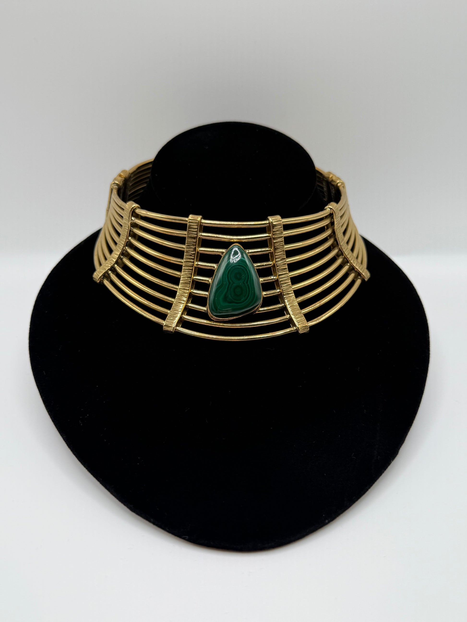 Command attention with Verdant Reign, a bold, sculptural choker crowned by a teardrop green jasper centerpiece. The rich forest tones of the stone echo grounding energy and natural elegance, while the architectural brass framework evokes power and royalty. This piece is made for the unapologetically confident a wearable crown for the neck. Whether styled with sleek minimalism or layered decadence, it brings instant edge and timeless allure.