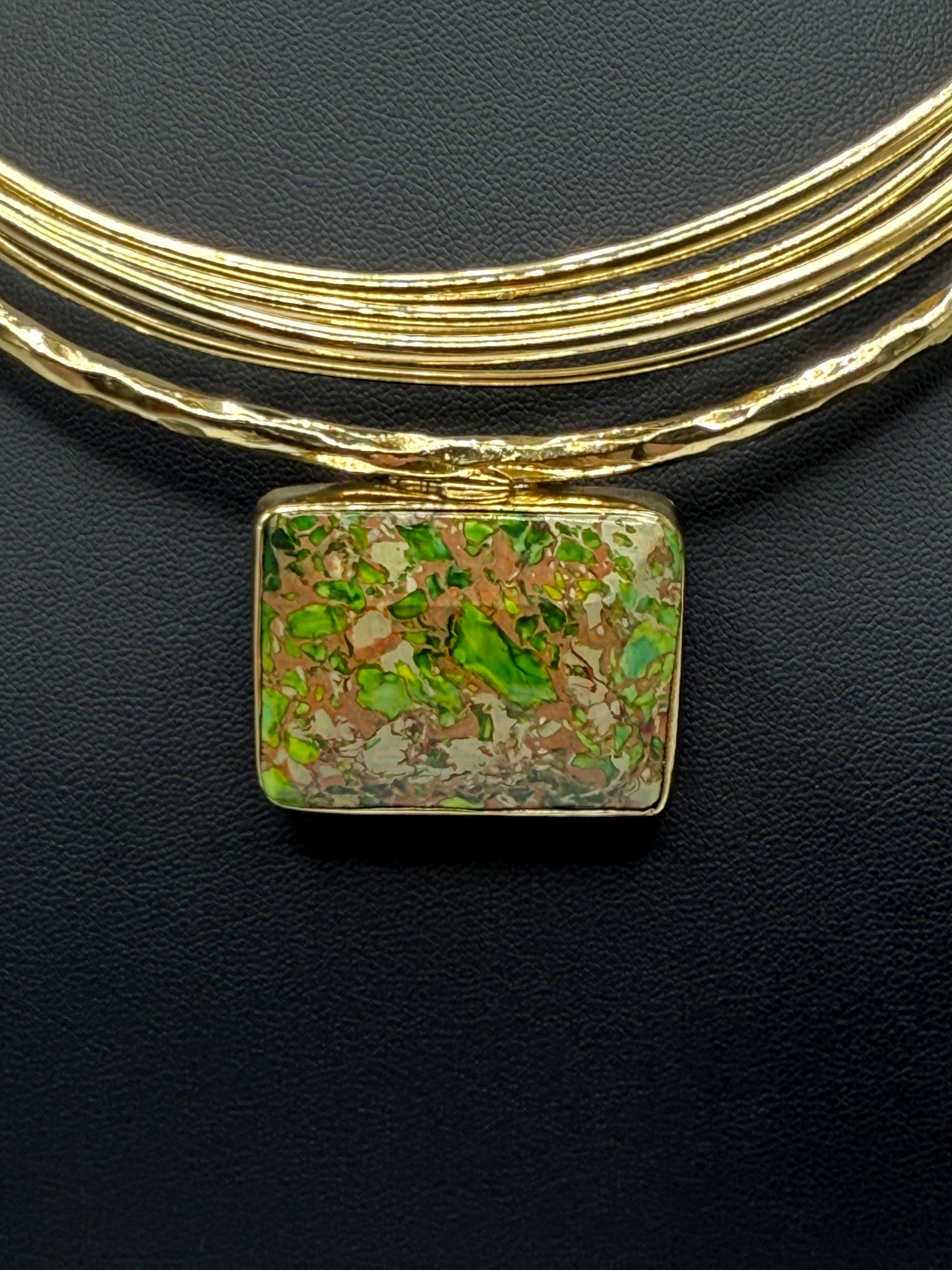 A symphony of golden lines cascades into a striking sea bed jasper pendant — grounding yet luminous.