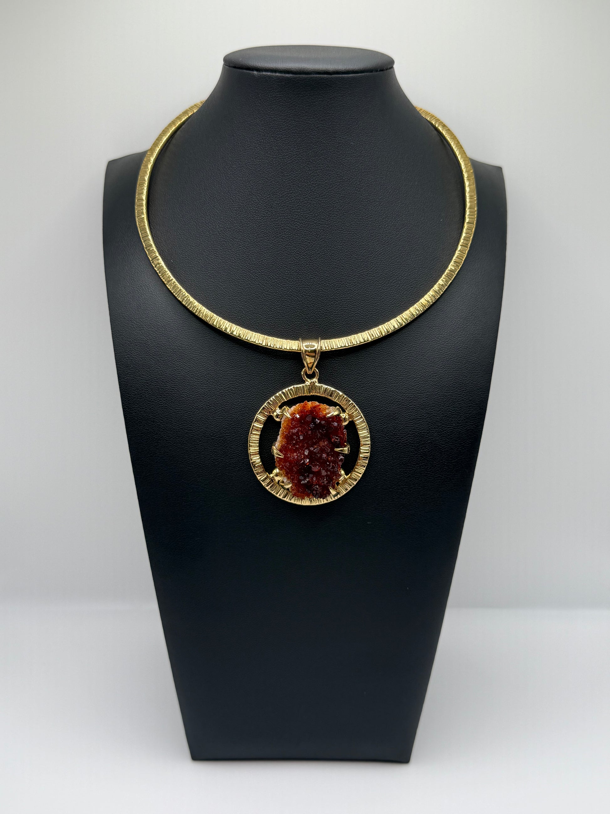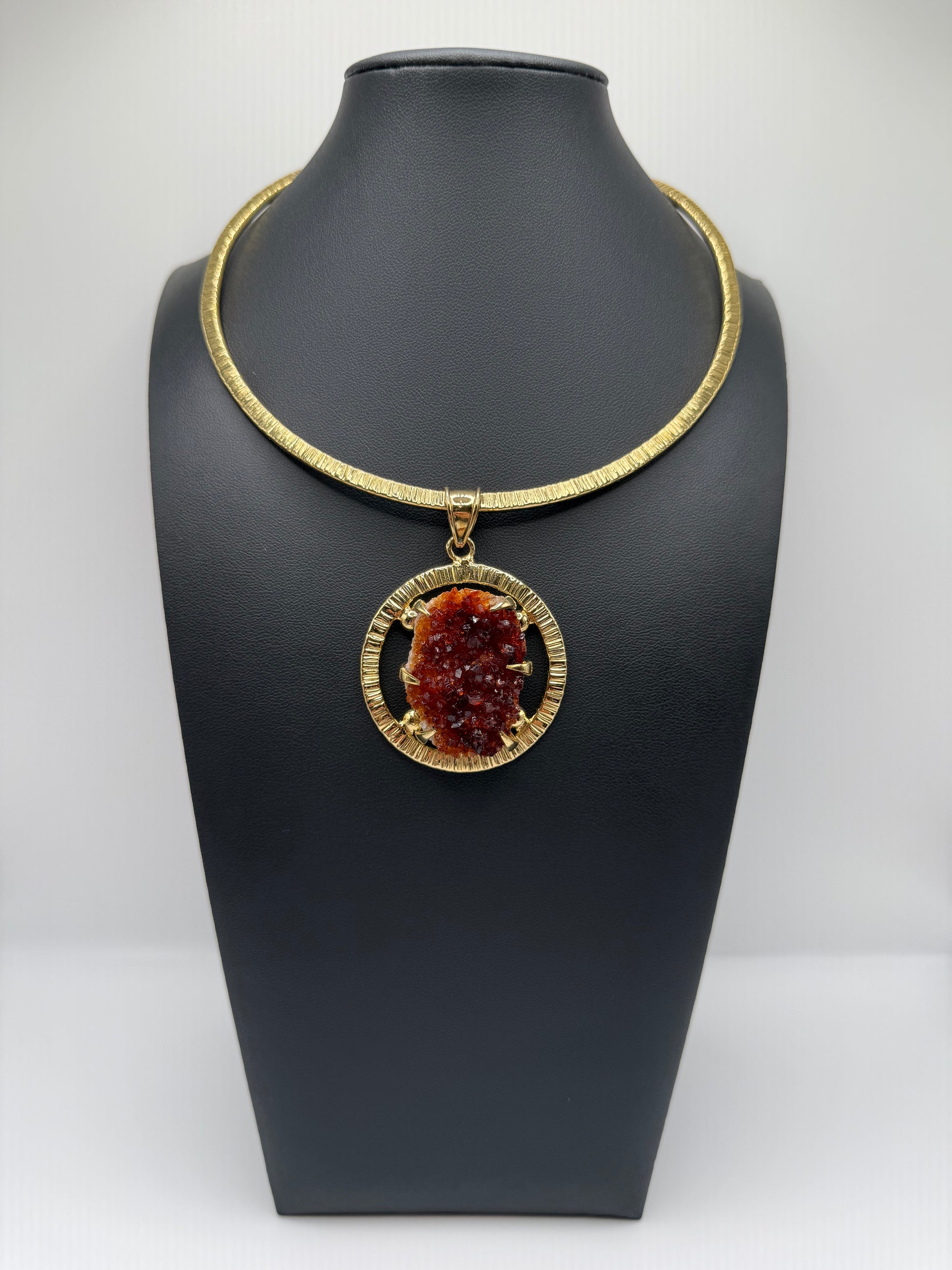 Fierce and fiery, Amber Halo radiates the warmth and brilliance of a setting sun. This captivating pendant features a bold and dark crystal, its texture catching the light with every movement. Framed by a textured golden halo, it evokes the feeling of eternal flame powerful, passionate, and untamed. Perfect for those who carry fire in their spirit and warmth in their presence.