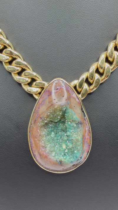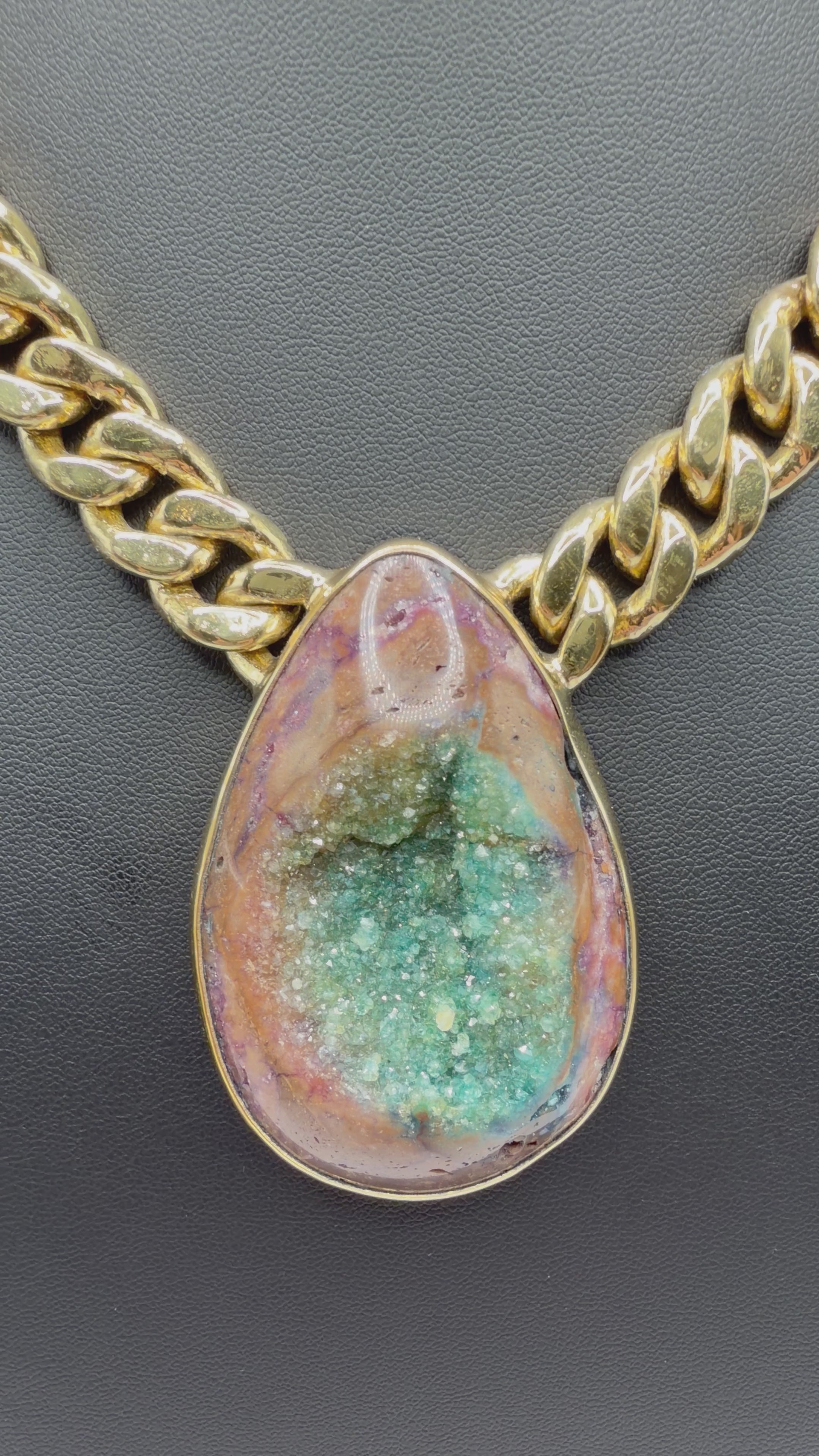 A grounded yet luminous statement, the Sage Terra Icon Chain features a one-of-a-kind earthy green stone blended with soft lavender undertones and a crystalline center. Its natural gradients create a calm yet dimensional focal point that feels both organic and refined. Set on the bold architecture of the Icon Chain, this piece brings together natural serenity and sculptural presence.