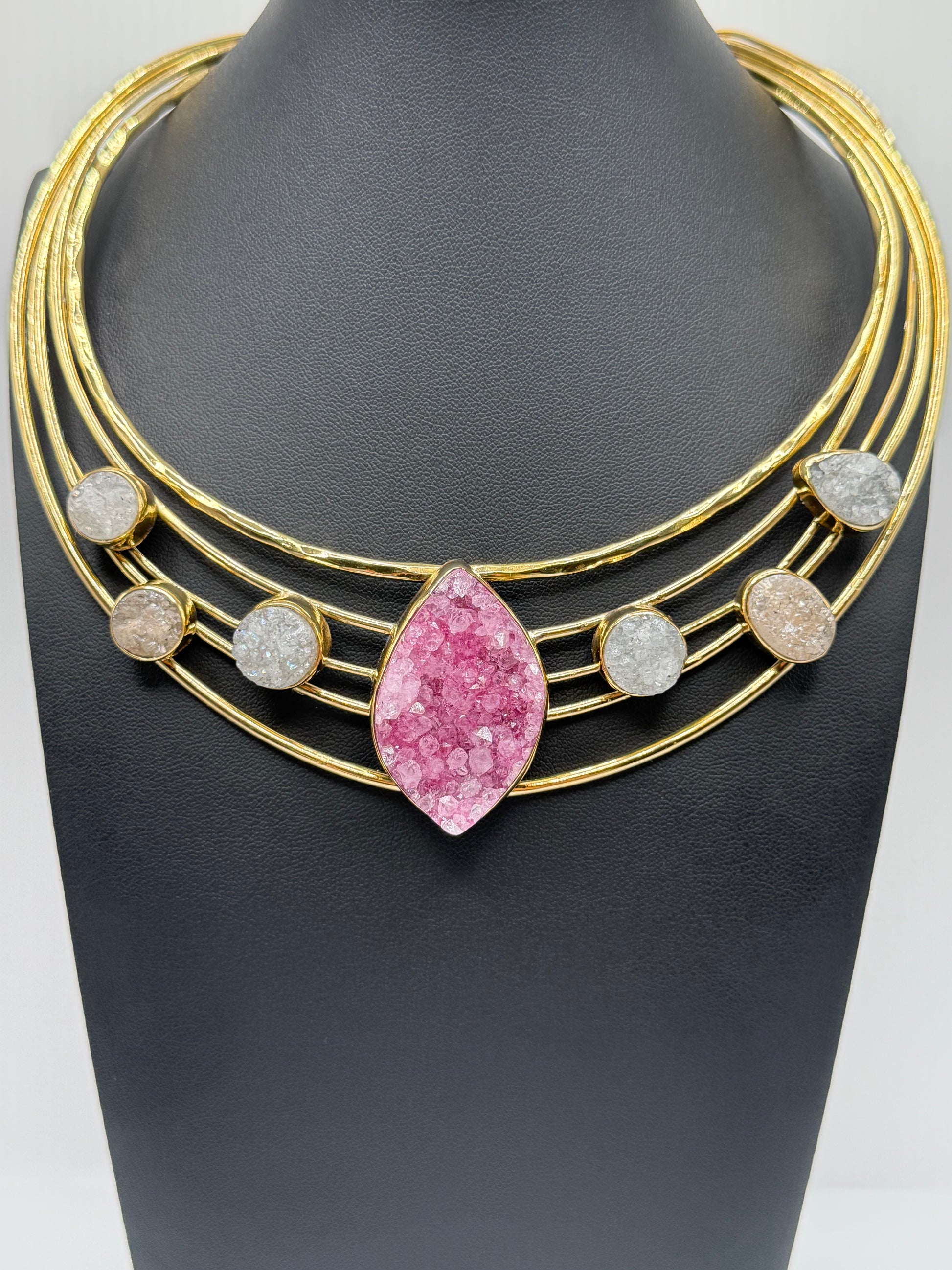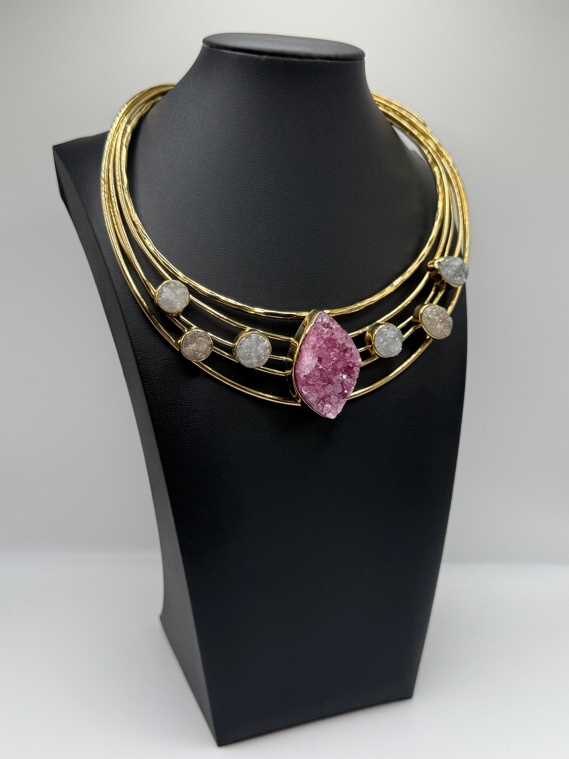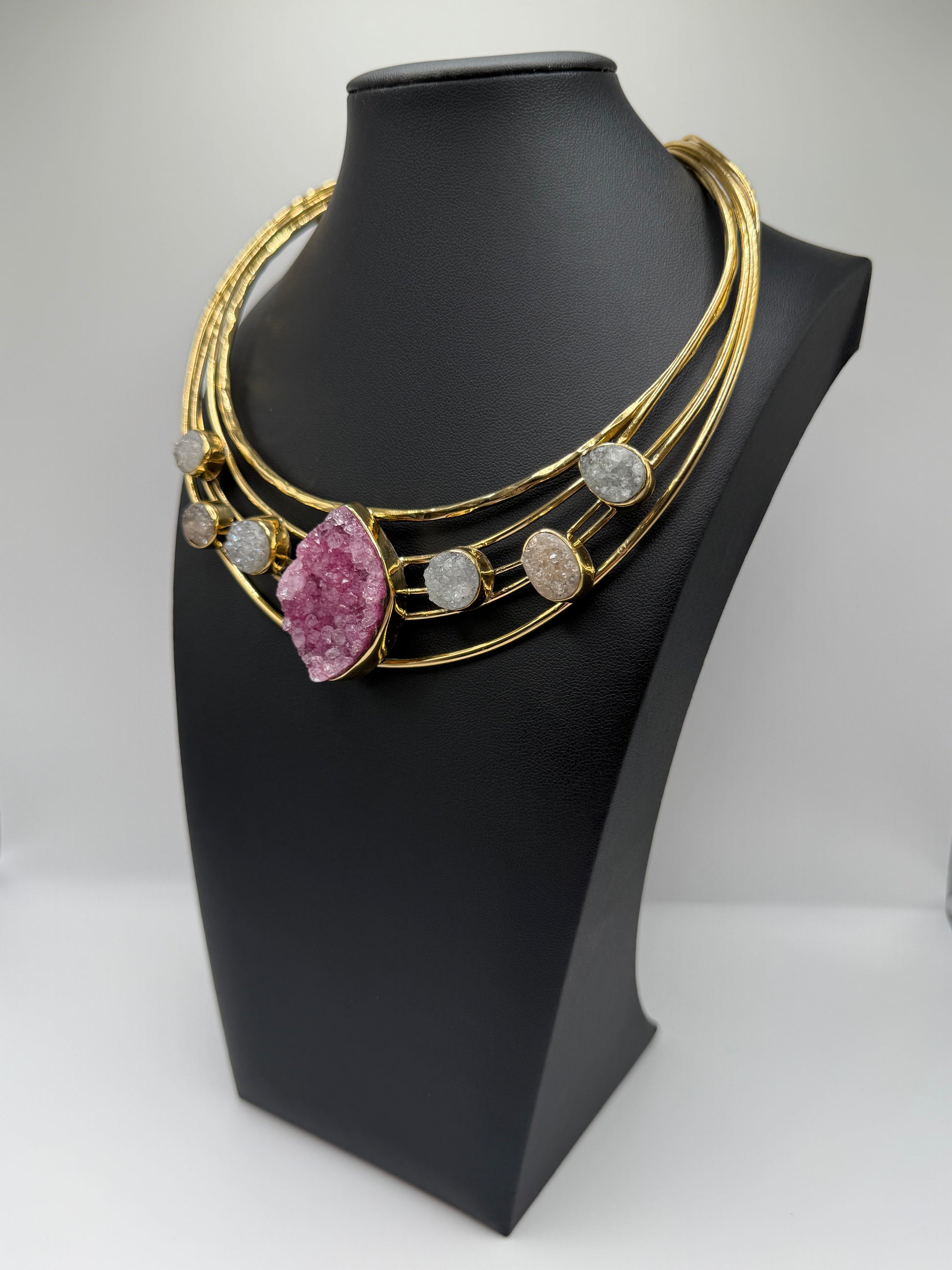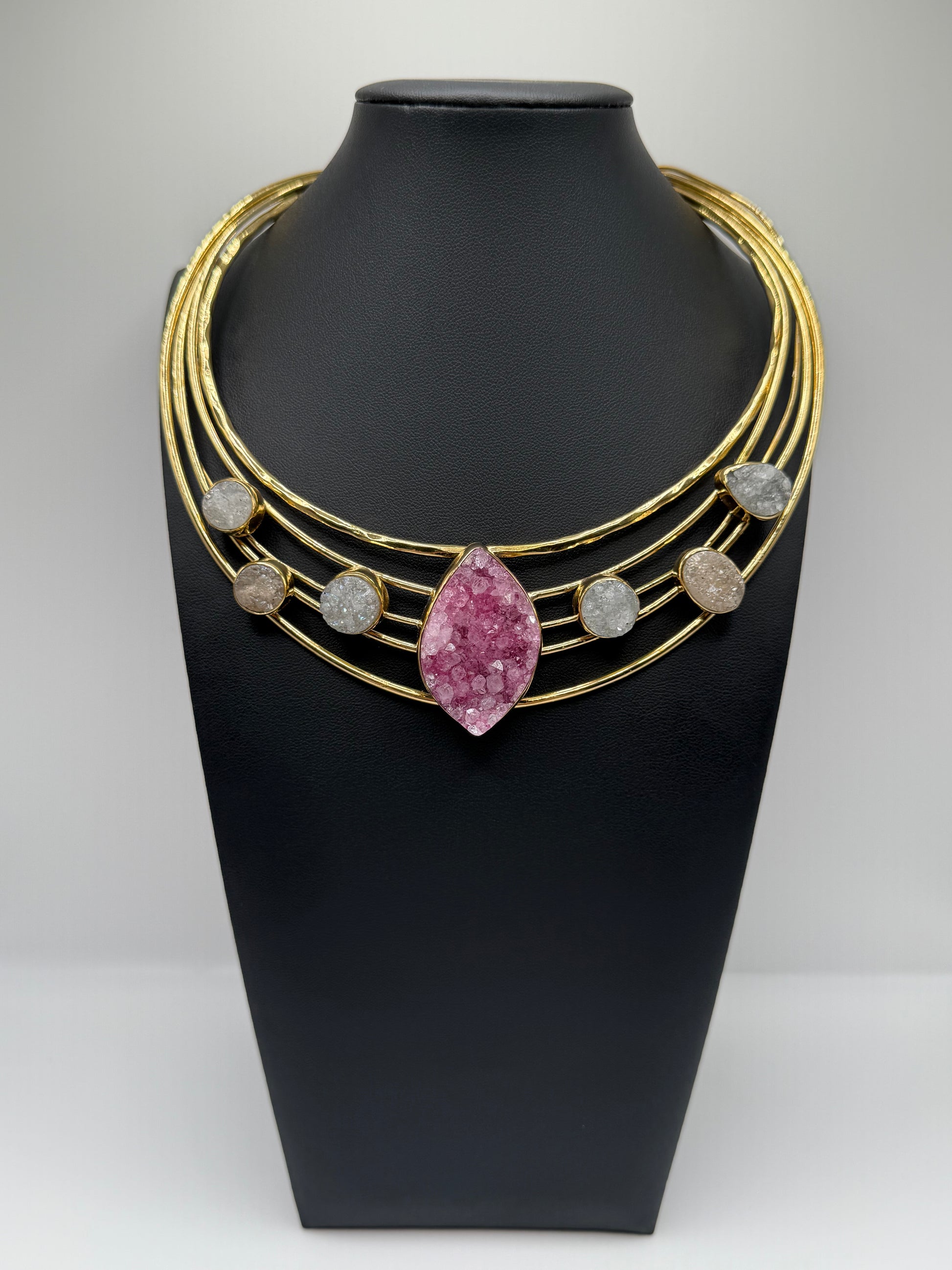 Like a whispered song from the stars, Stellar Rose is a celestial ode to the divine feminine. At its center blooms a pink druzy crystal, set among orbiting stones that shimmer like stardust in motion. Wrapped in golden arcs that echo planetary rings, this piece feels both cosmic and tender a luminous harmony of light, love, and elegance. Designed for the dreamer who leads with heart and stuns with presence.
