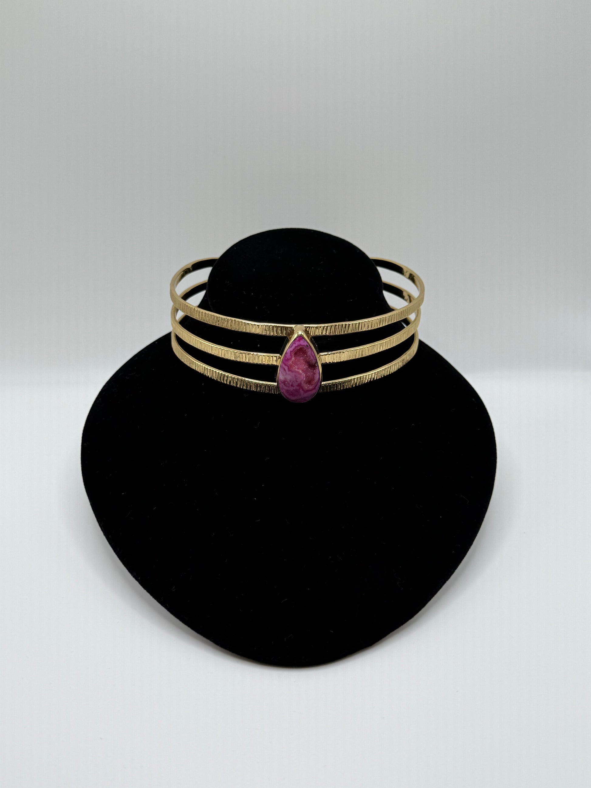 Vibrant and rare, Crimson Aura radiates warmth and intention. The natural marbling of its deep rose stone tells a story of fire meeting earth — each curve alive with organic movement and quiet strength. Framed in hand-textured gold, it embodies passion refined — a statement of feminine power that commands attention without ever needing to ask for it.