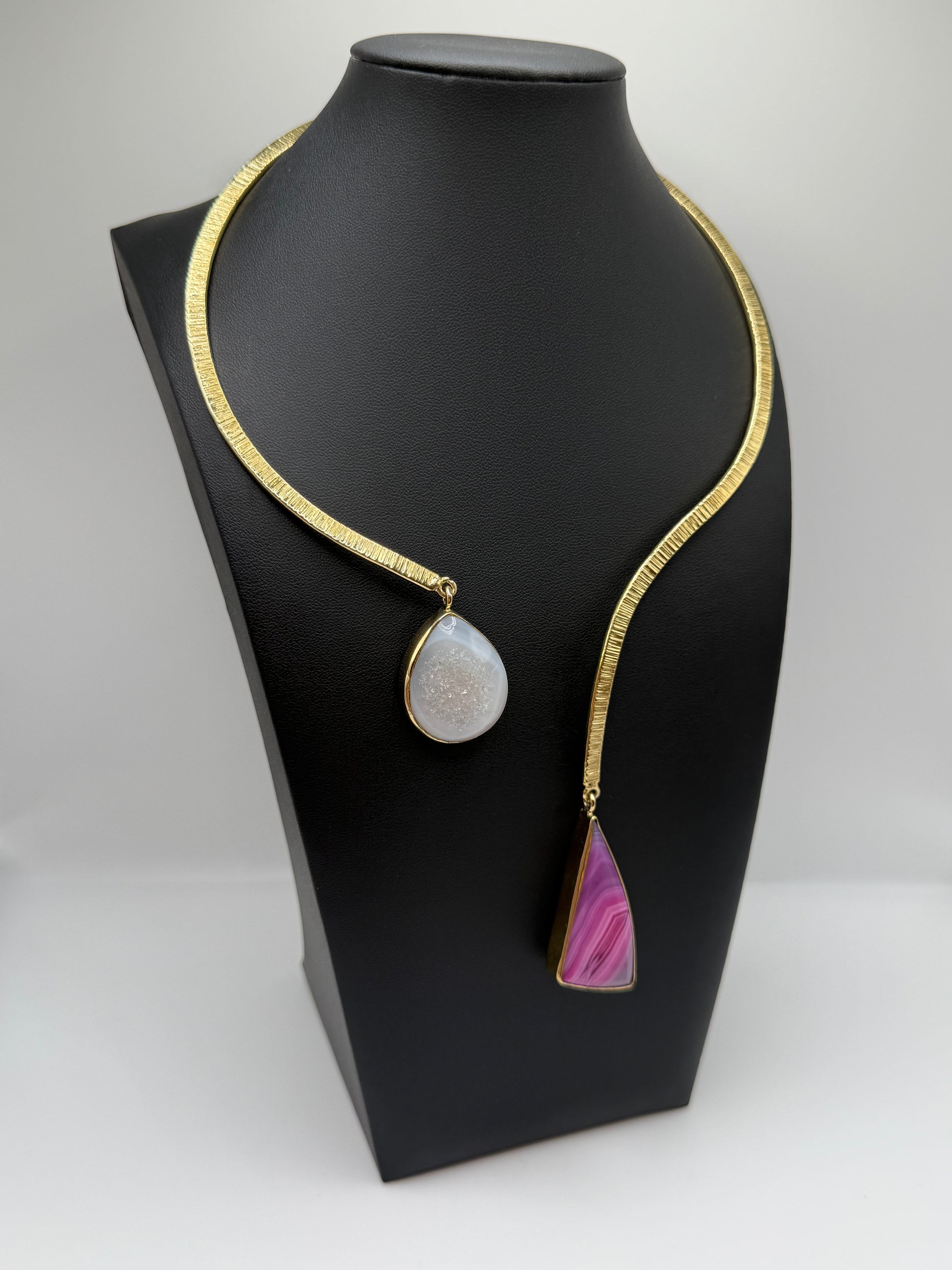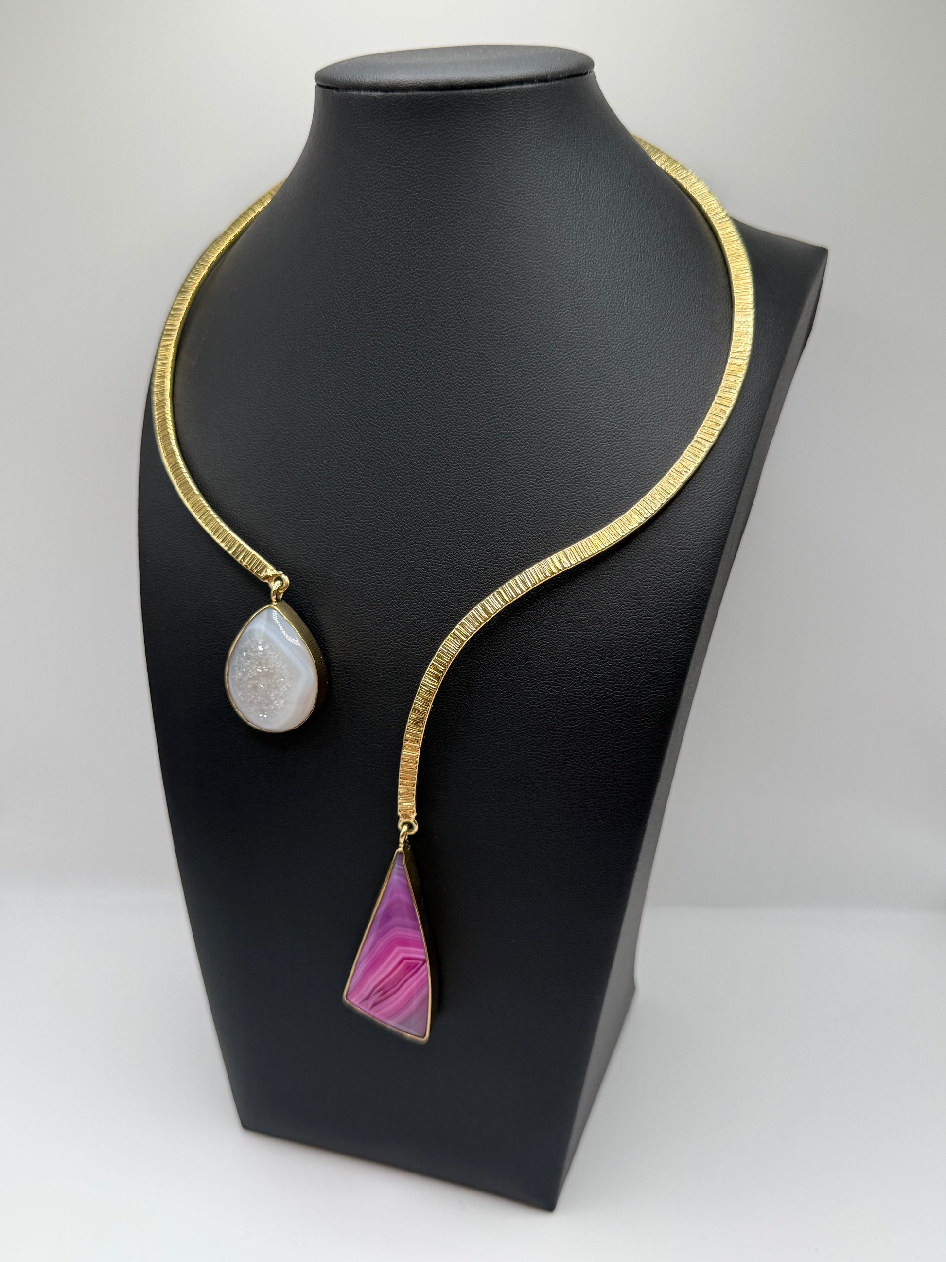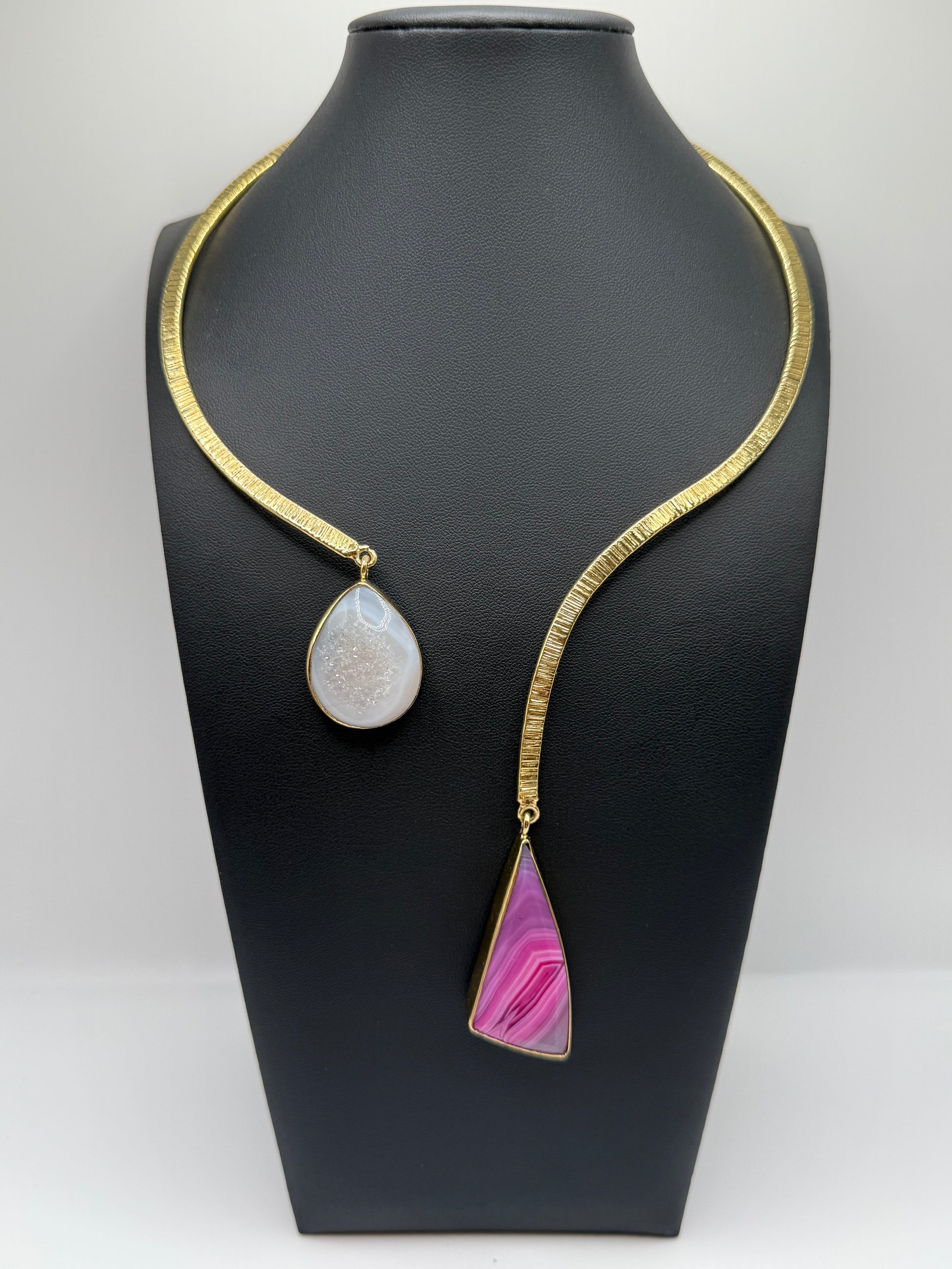 Vibrant pink agate meets a soft white druzy in an asymmetric dance of texture and light. The brass form curves gracefully, balancing bold color with quiet shimmer. Electric Bloom celebrates contrast — fierce yet feminine, radiant yet refined.