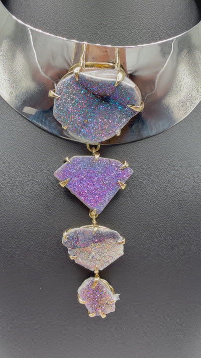 A truly enchanted statement within the Singularity setting, the Cosmic Unicorn Collar feels like something discovered in a dream and destined for a woman who leads with both whimsy and power. The cascading unicorn-toned druzy glimmers with iridescent flashes of violet, rose, and electric blue, creating the kind of sparkle that feels almost otherworldly.