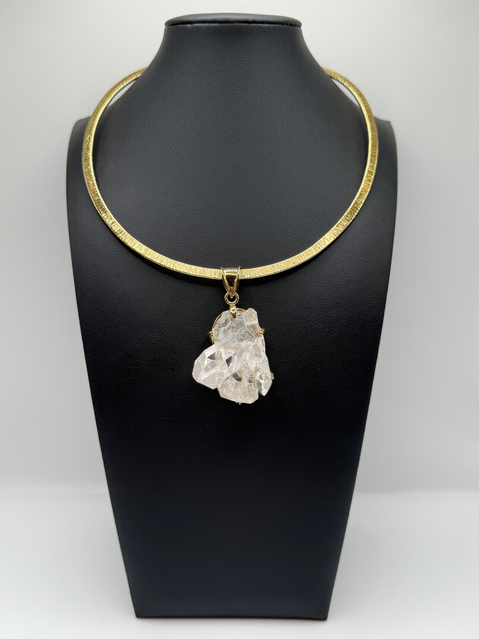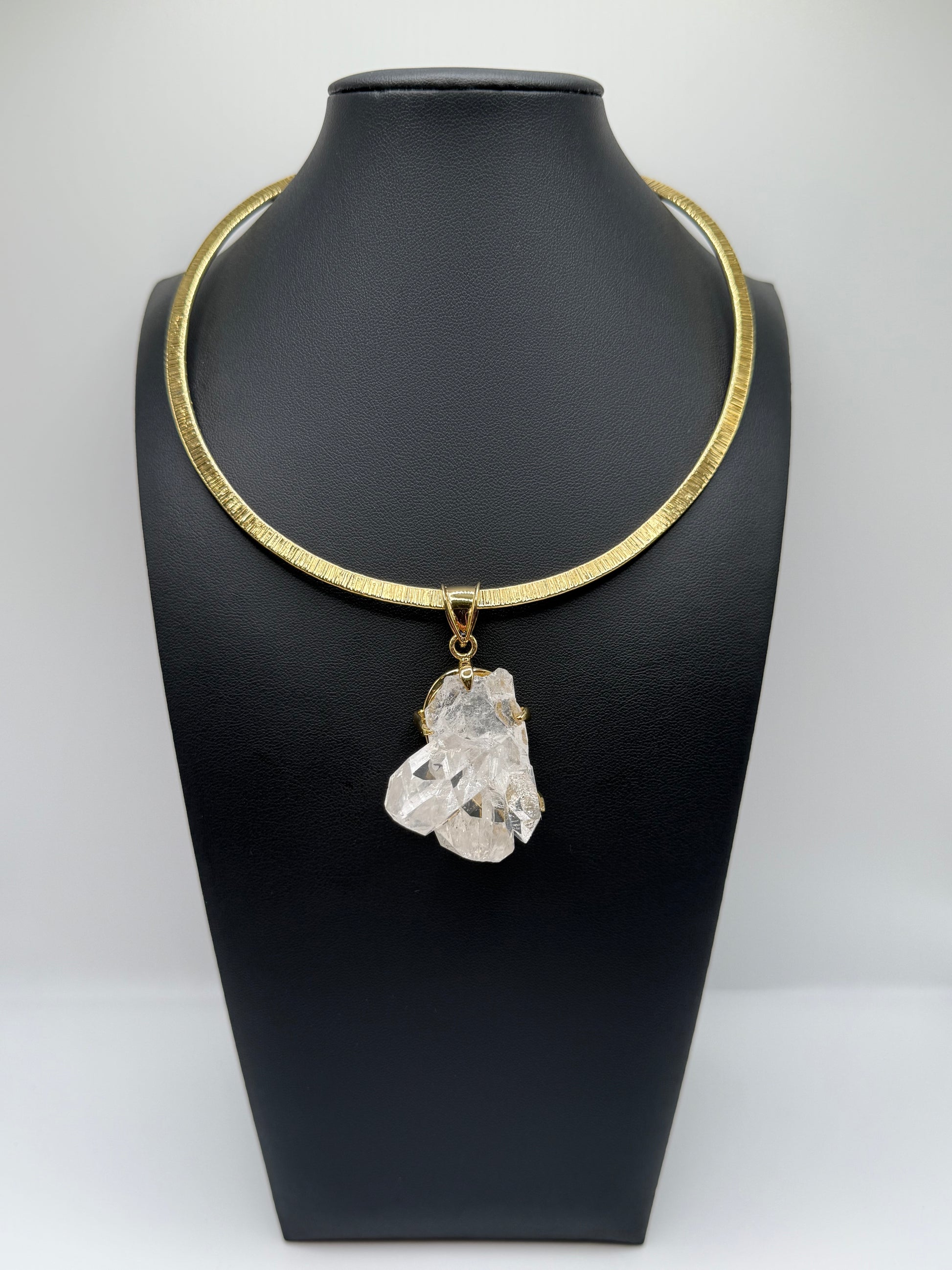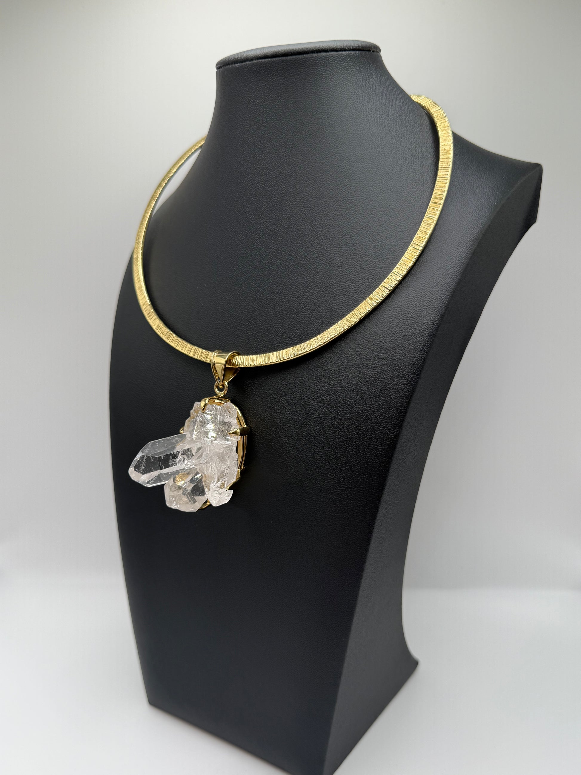 Bold quartz suspended from a structured, textured brass form — where raw energy meets refined design. Each crystal formation is one-of-one, catching light with effortless brilliance. Worn as a symbol of clarity and elevation, iconic "Quarts Clarity" embodies the art of rising with grace.