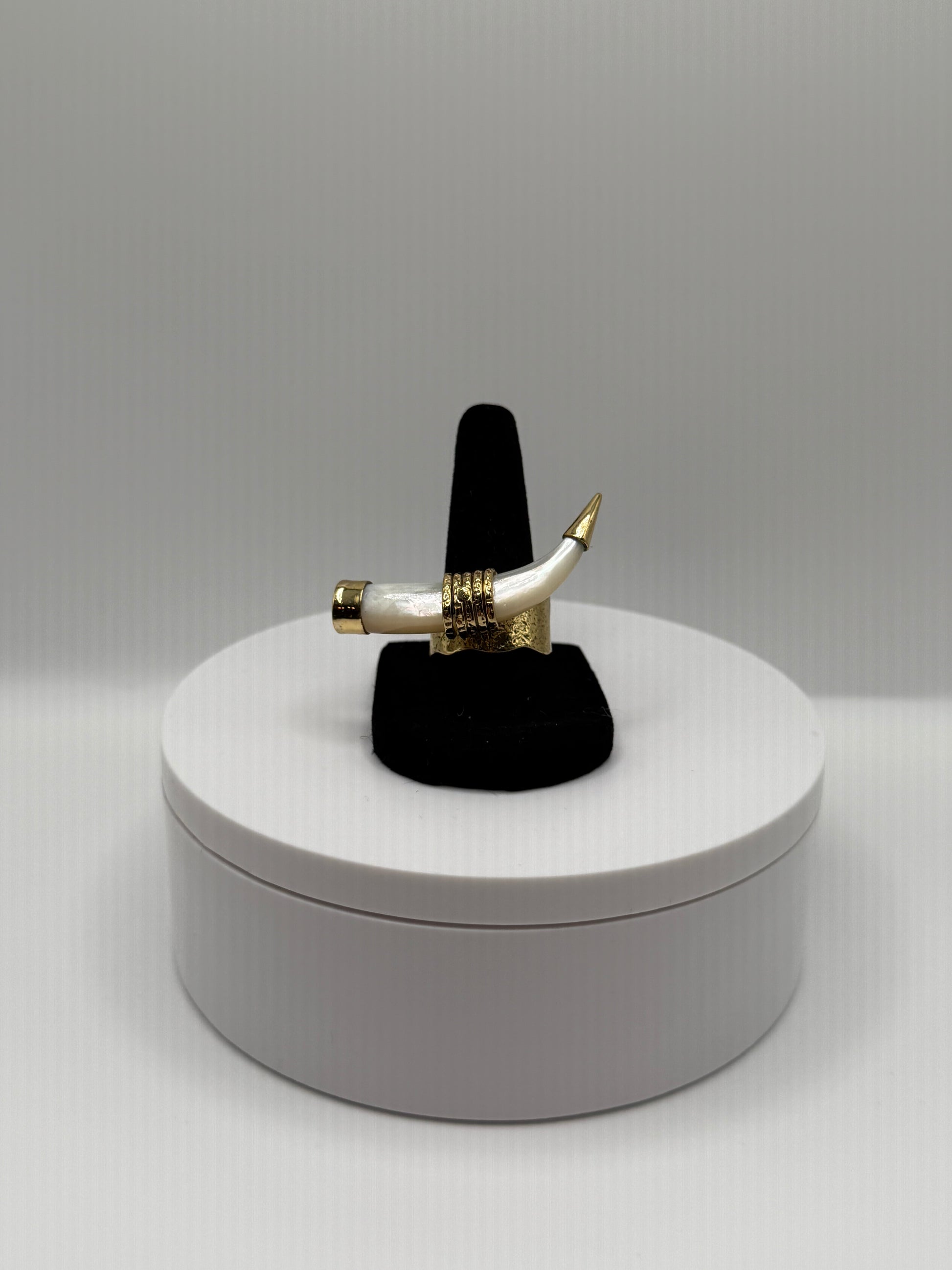 The Mother of Pearl Ring is a bold fusion of elegance and edge. Featuring a gleaming mother-of-pearl inlay adorned with intricate gold-toned brass details, this ring embodies strength and sophistication. Its unique design makes it a standout accessory, perfect for anyone looking to add a touch of fierce elegance to their collection.