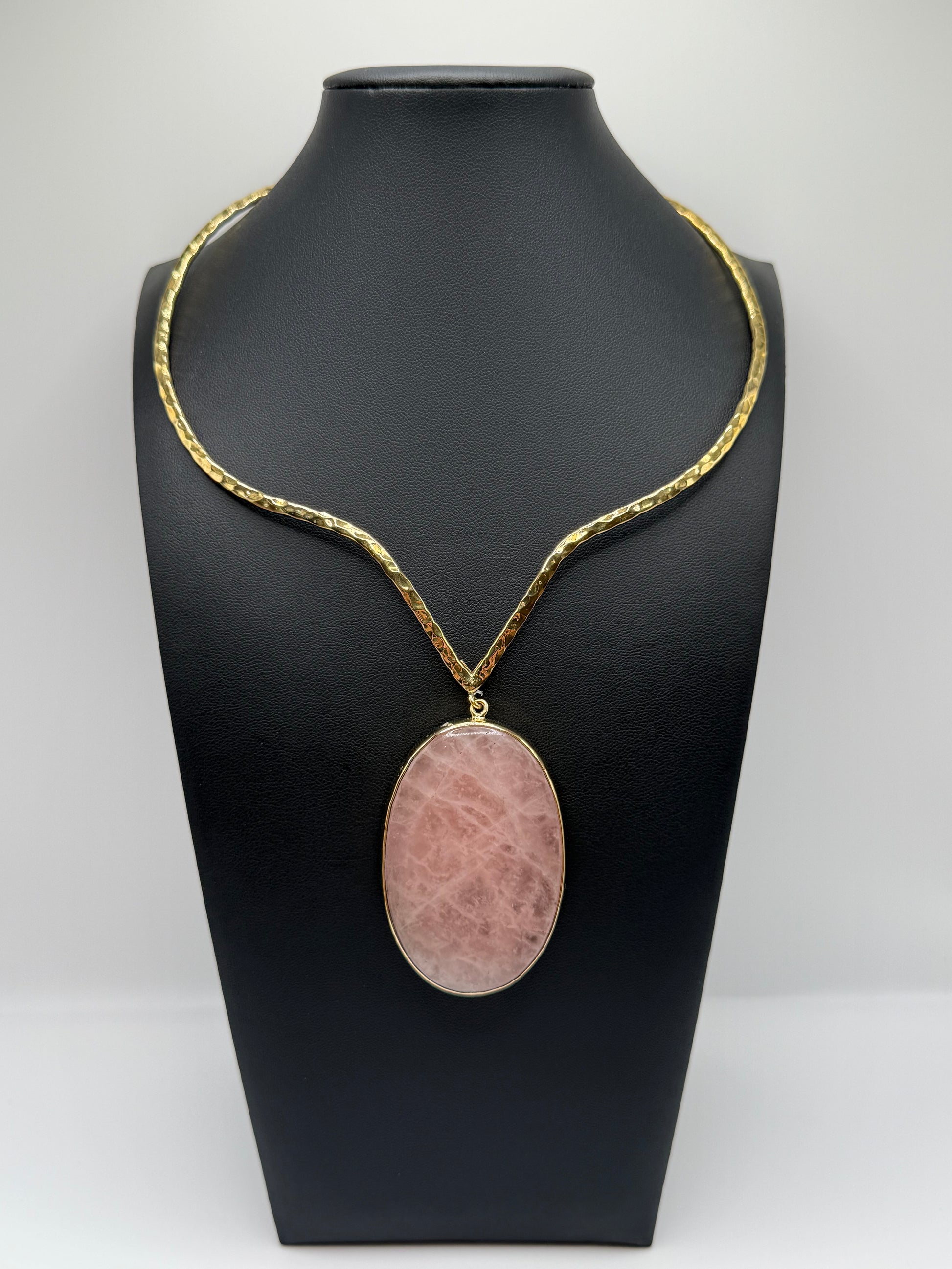 Hand polished rose quartz centerpiece framed in hammered brass, balancing tenderness with strength. Its natural blush tone glows with understated elegance — a symbol of self-love, grace, and quiet resilience. Rose Resonance embodies beauty that begins within.