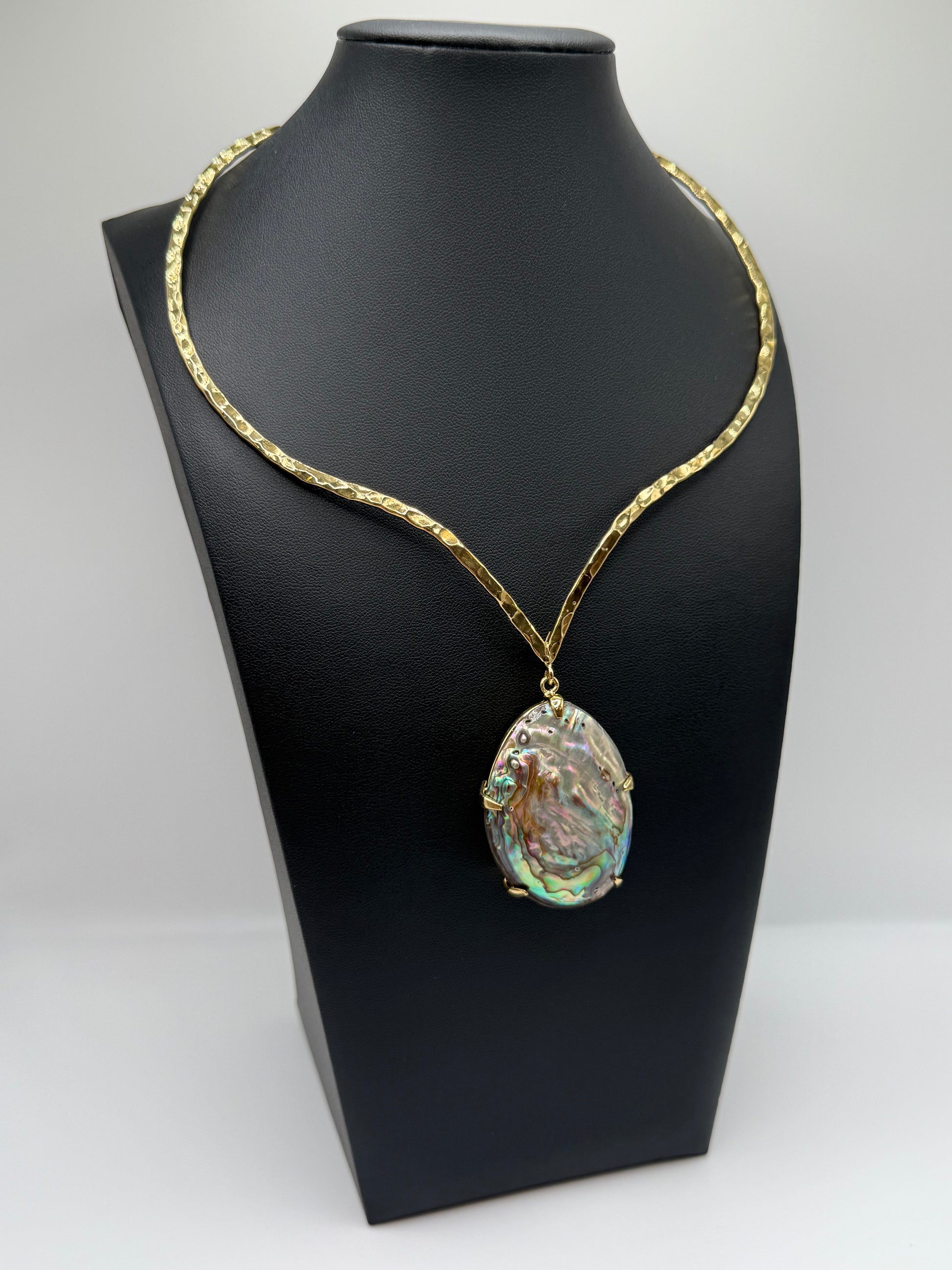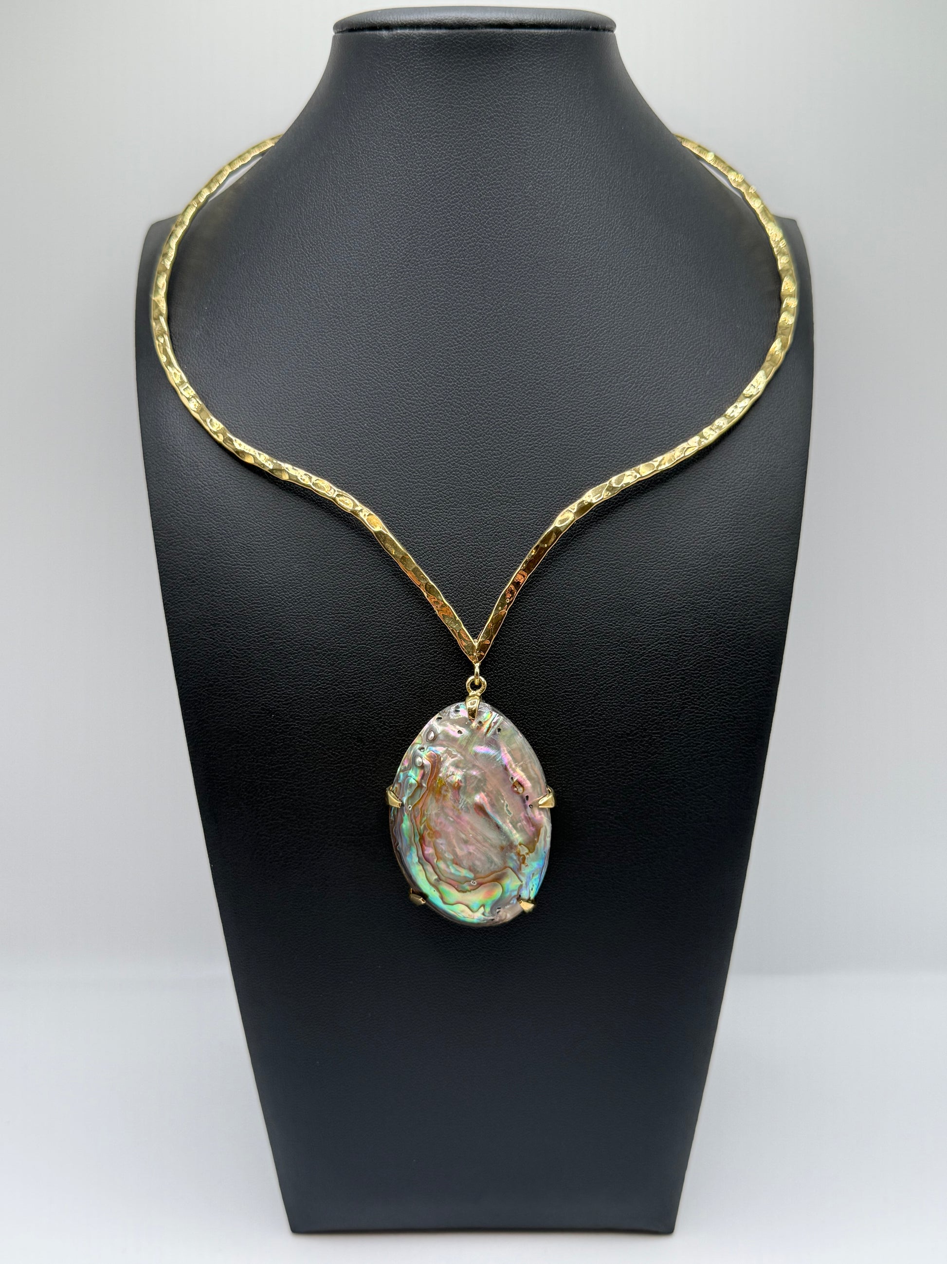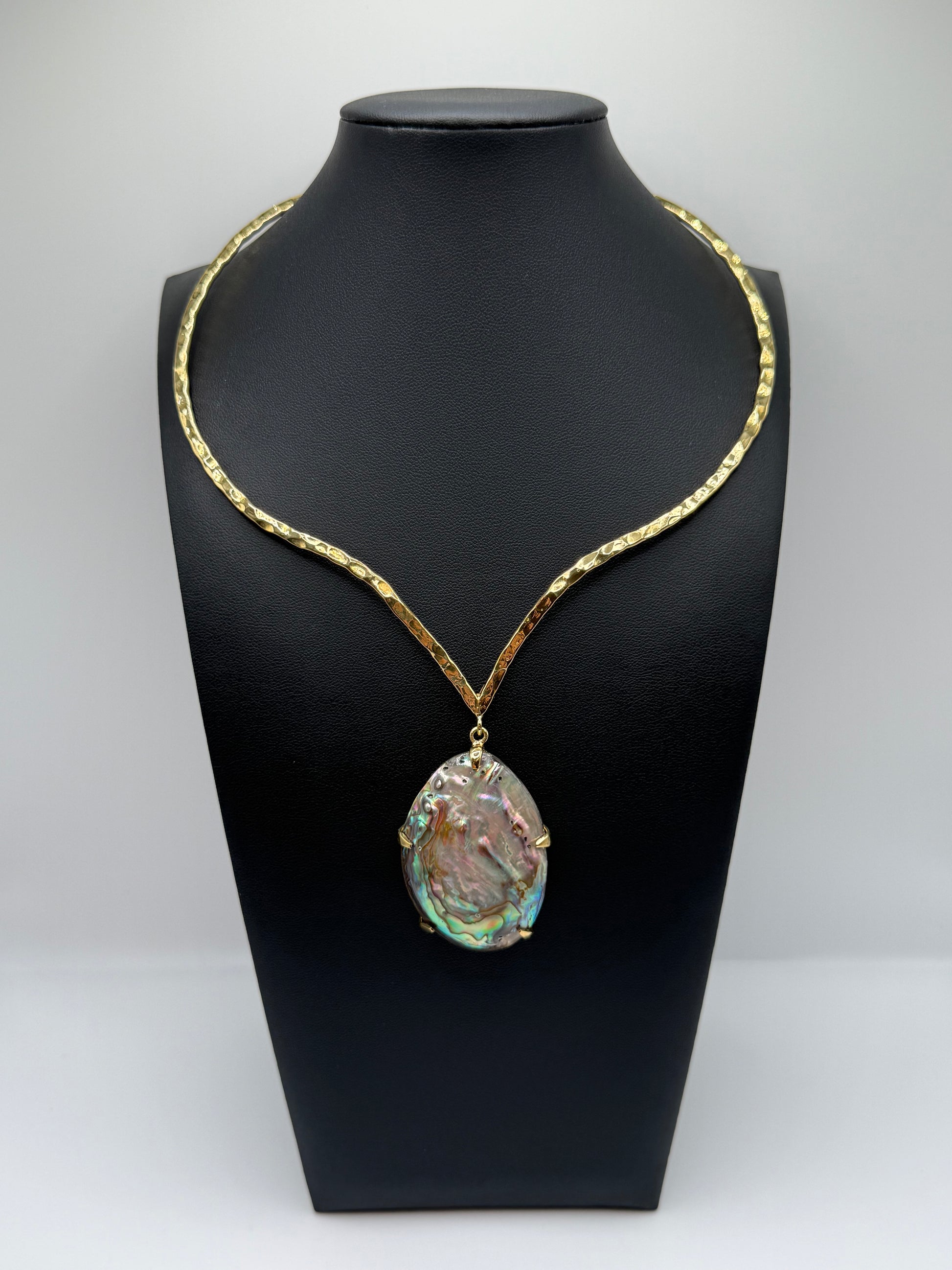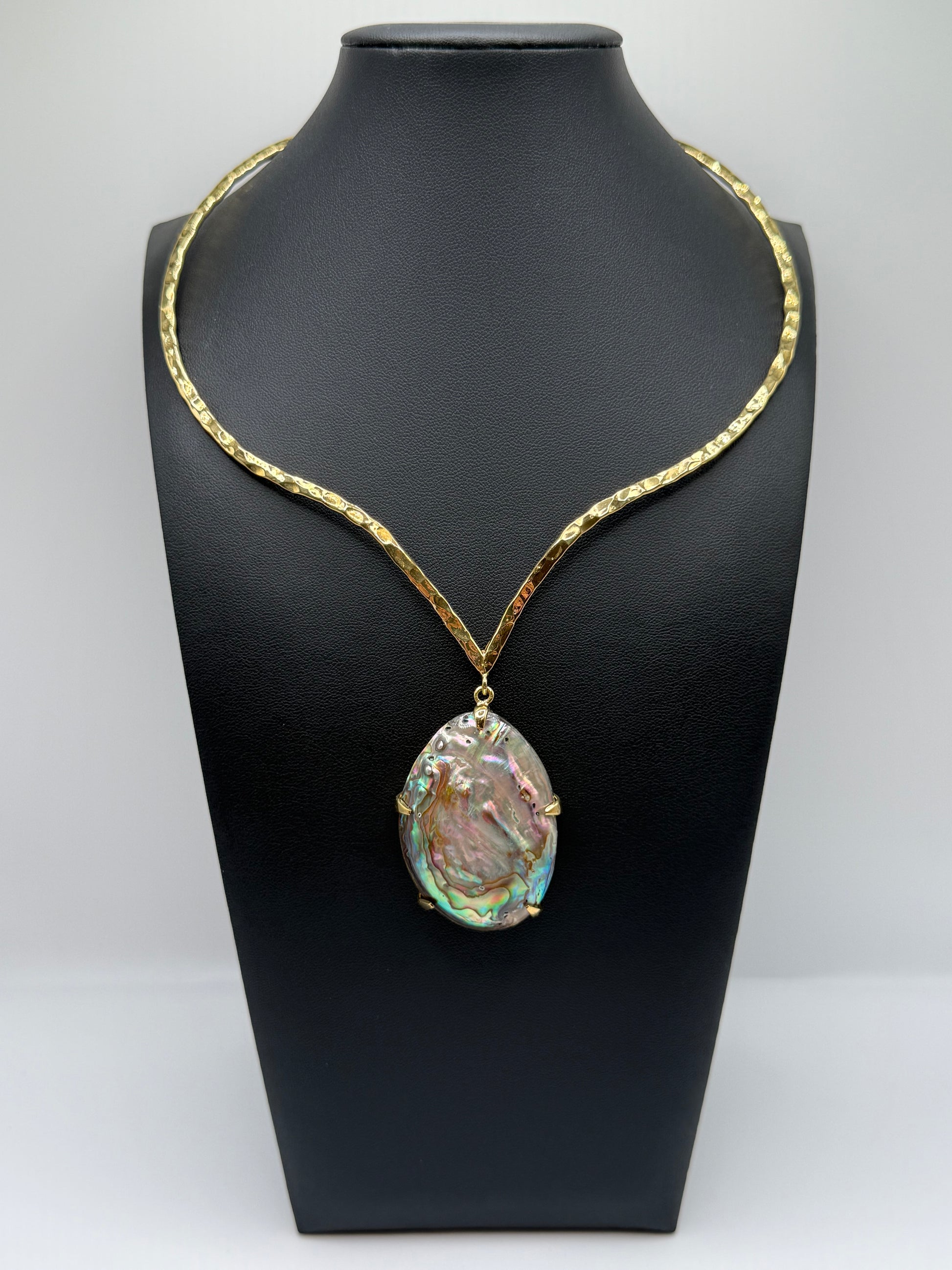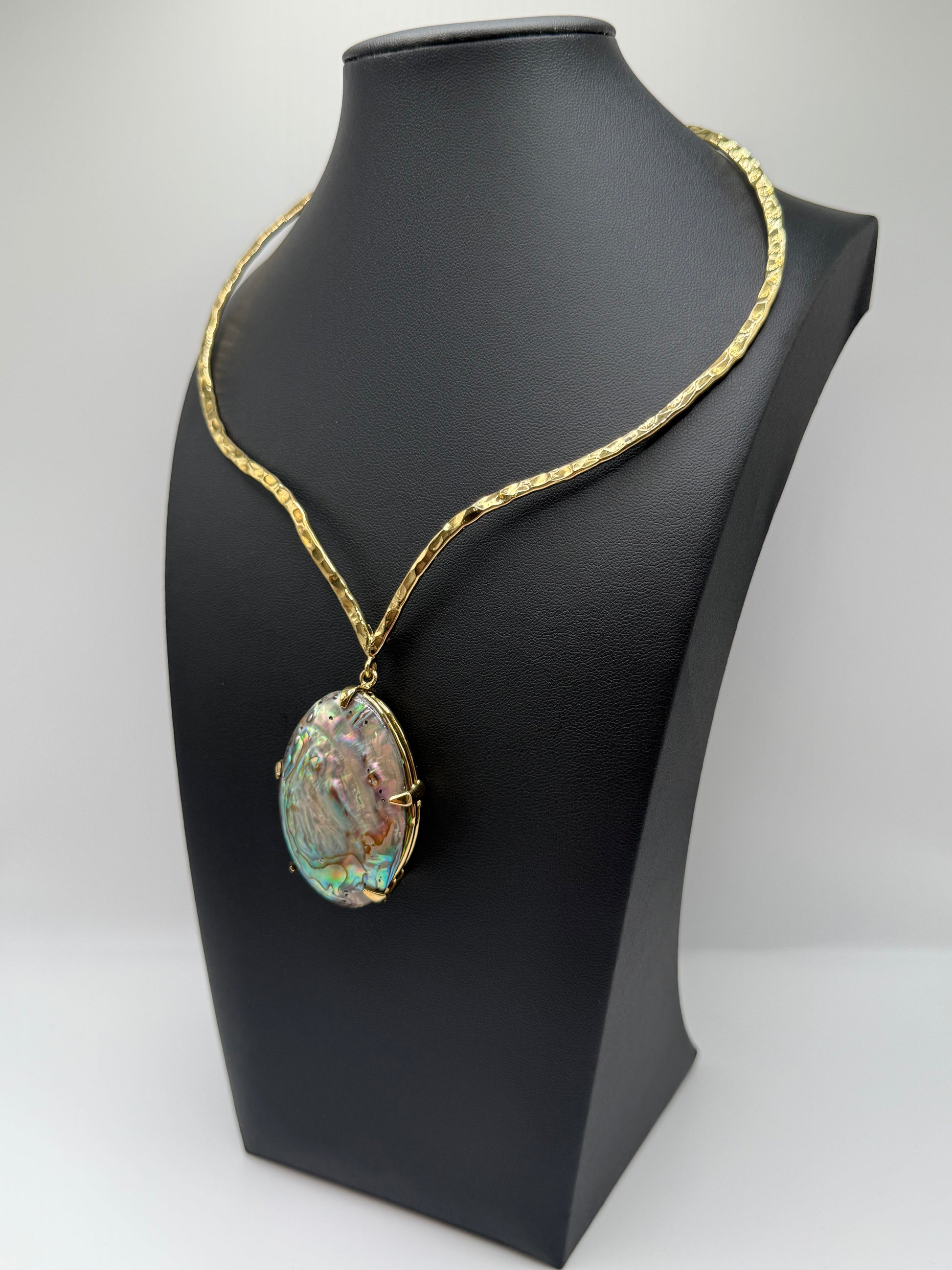 A natural abalone shell shimmers in layers of shifting color, framed by a hand-hammered brass form. Its surface reflects oceanic depth and luminous calm — fluid, captivating, and entirely one-of-one. Iridescent Tide embodies grace in motion, the beauty of change made visible.