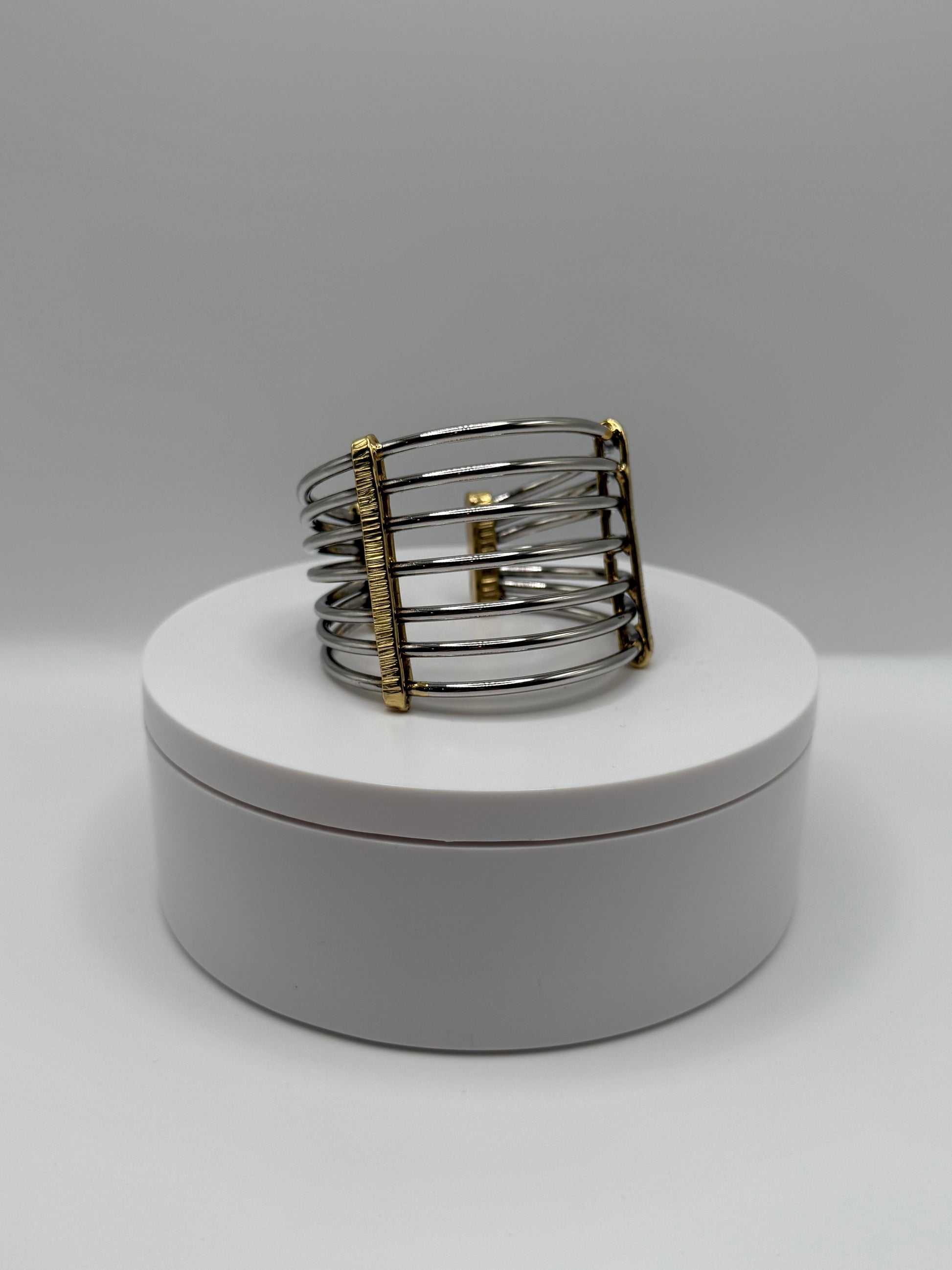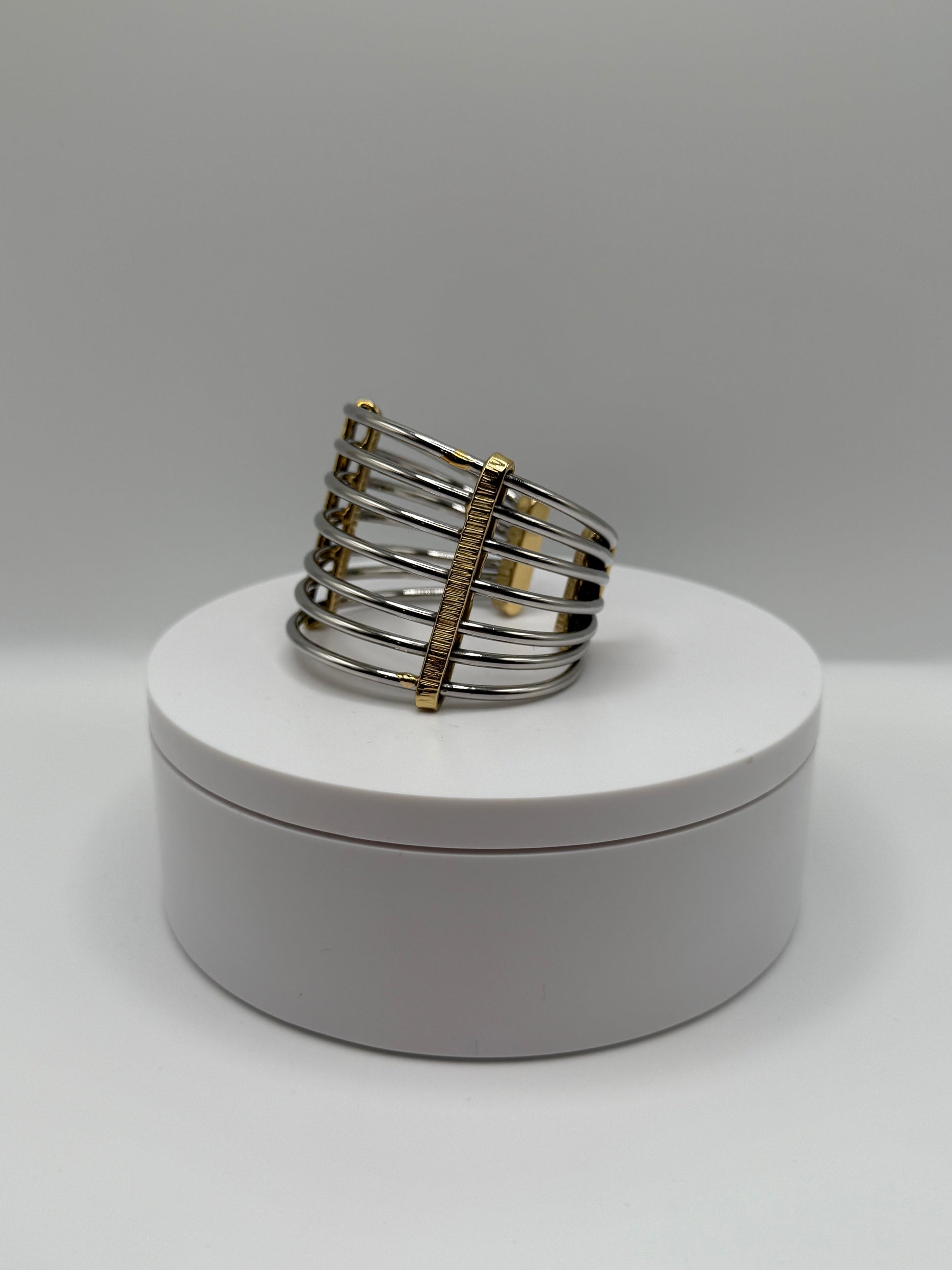 Crafted for contrast — and the woman who embodies it — the Polarity Cuff plays with duality in both form and finish. Bold steel bands are stacked in deliberate rhythm, while textured gold-toned brass columns connect them with sculptural strength. The result is a statement piece that feels both futuristic and grounded clean lines meeting artisan energy.