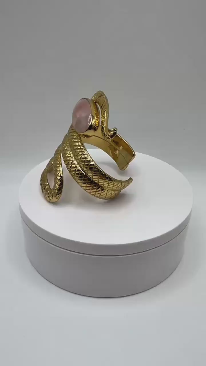 The Serpent Cuff wraps the wrist in golden armor, coiled with intention and symbolic power. This striking piece features a textured, high-polish gold serpent that winds upward in a bold spiral, crowned with a luminous rose quartz cabochon. Known as the stone of unconditional love, rose quartz brings a soft balance to the cuff’s fierce form—offering emotional clarity, feminine energy, and quiet strength. Together, the serpent and stone create a story of transformation, healing, and magnetism. Fierce yet fluid, protective yet nurturing, this cuff is a talisman for the woman becoming her next evolution.