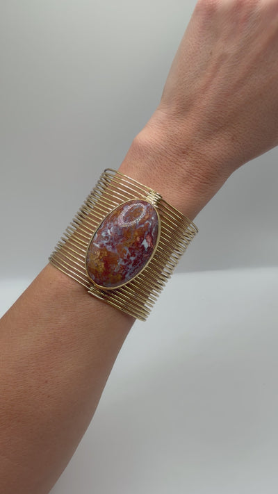 A radiant, sculptural statement crafted on the fluid lines of the Infinity cuff setting. This one-of-a-kind piece showcases a sun-washed jasper centerpiece, alive with warm tones of amber, crimson, gold, and soft lilac. Its naturally marbled surface feels both earthy and luminous, offering a presence piece that brings effortless warmth to any look.